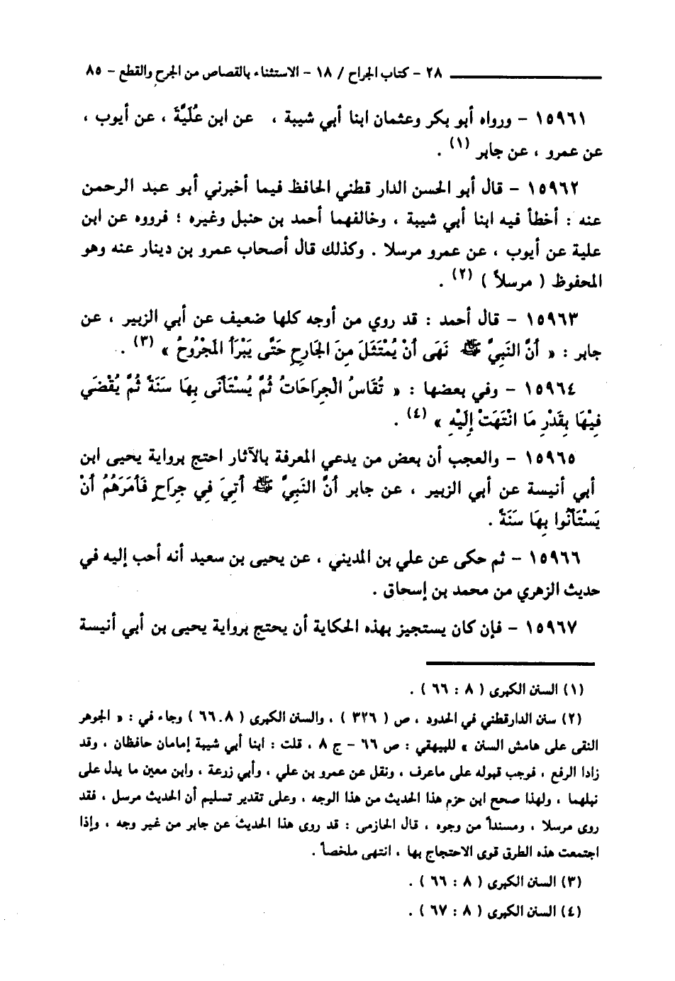 15965 - وَالْعَجَبُ أَنَّ بَعْضَ مَنْ يَدَّعِي الْمَعْرِفَةَ بِالْآثَارِ احْتَجَّ بِرِوَايَةِ يَحْيَى بْنِ أَبِي أُنَيْسَةَ , عَنْ أَبِي الزُّبَيْرِ , عَنْ جَابِرٍ , أَنَّ النَّبِيَّ صَلَّى اللهُ عَلَيْهِ وَسَلَّمَ: «أُتِيَ فِي جِرَاحٍ , فَأَمَرَهُمْ أَنْ يَسْتَأْنُوا بِهَا سَنَةً» ,