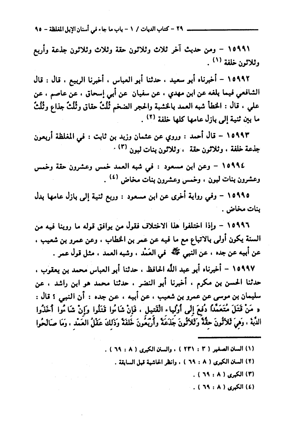 15994 - وَعَنَ ابْنِ مَسْعُودٍ: فِي شِبْهِ الْعَمْدِ خَمْسٌ وَعِشْرُونَ حِقَّةً وَخَمْسٌ وَعِشْرُونَ بَنَاتِ لَبُونٍ , وَخَمْسٌ وَعِشْرُونَ بَنَاتِ مَخَاضٍ ,