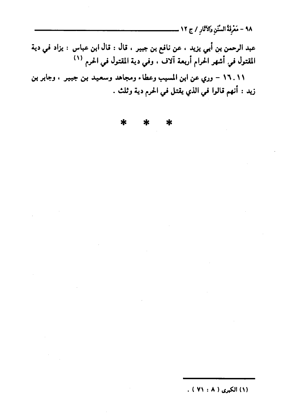 16011 - رُوِيَ عَنِ ابْنِ الْمُسَيِّبِ , وَعَطَاءٍ , وَمُجَاهِدٍ , وَسَعِيدِ بْنِ جُبَيْرٍ , وَجَابِرِ بْنِ زَيْدٍ: أَنَّهُمْ قَالُوا فِي " §الَّذِي يُقْتَلُ فِي الْحَرَمِ: دِيَةٌ وَثُلُثٌ "