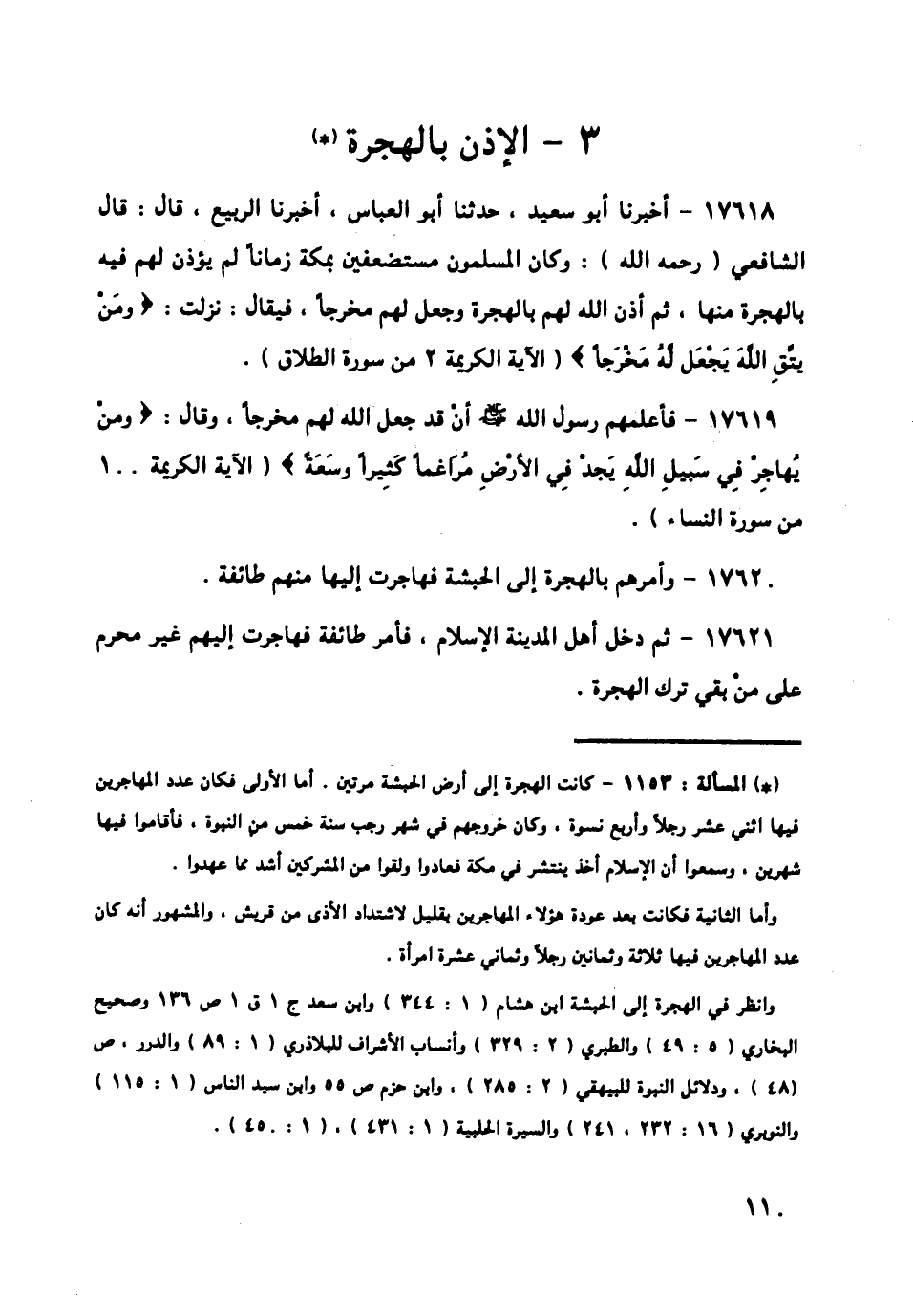 17622 - فَتَلَا الشَّافِعِيُّ فِيهِمْ آيَاتٍ قَالَ: ثُمَّ أَذِنَ اللَّهُ لِرَسُولِهِ صَلَّى اللهُ عَلَيْهِ وَسَلَّمَ بِالْهِجْرَةَ فَهَاجَرَ إِلَى الْمَدِينَةِ