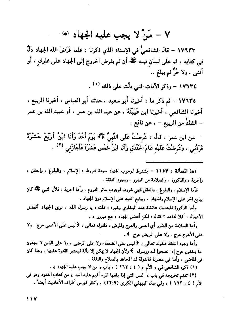 17633 - قَالَ الشَّافِعِيُّ فِي الْإِسْنَادِ الَّذِي ذَكَرْنَا: «فَلَمَّا فَرَضَ اللَّهُ الْجِهَادَ دَلَّ فِي كِتَابِهِ، ثُمَّ عَلَى لِسَانِ نَبِيِّهِ صَلَّى اللهُ عَلَيْهِ وَسَلَّمَ، أَنْ لَمْ يُفْرَضِ الْخُرُوجَ إِلَى الْجِهَادِ عَلَى مَمْلُوكٍ، أَوْ أُنْثَى، وَلَا حُرٍّ لَمْ يَبْلُغْ»