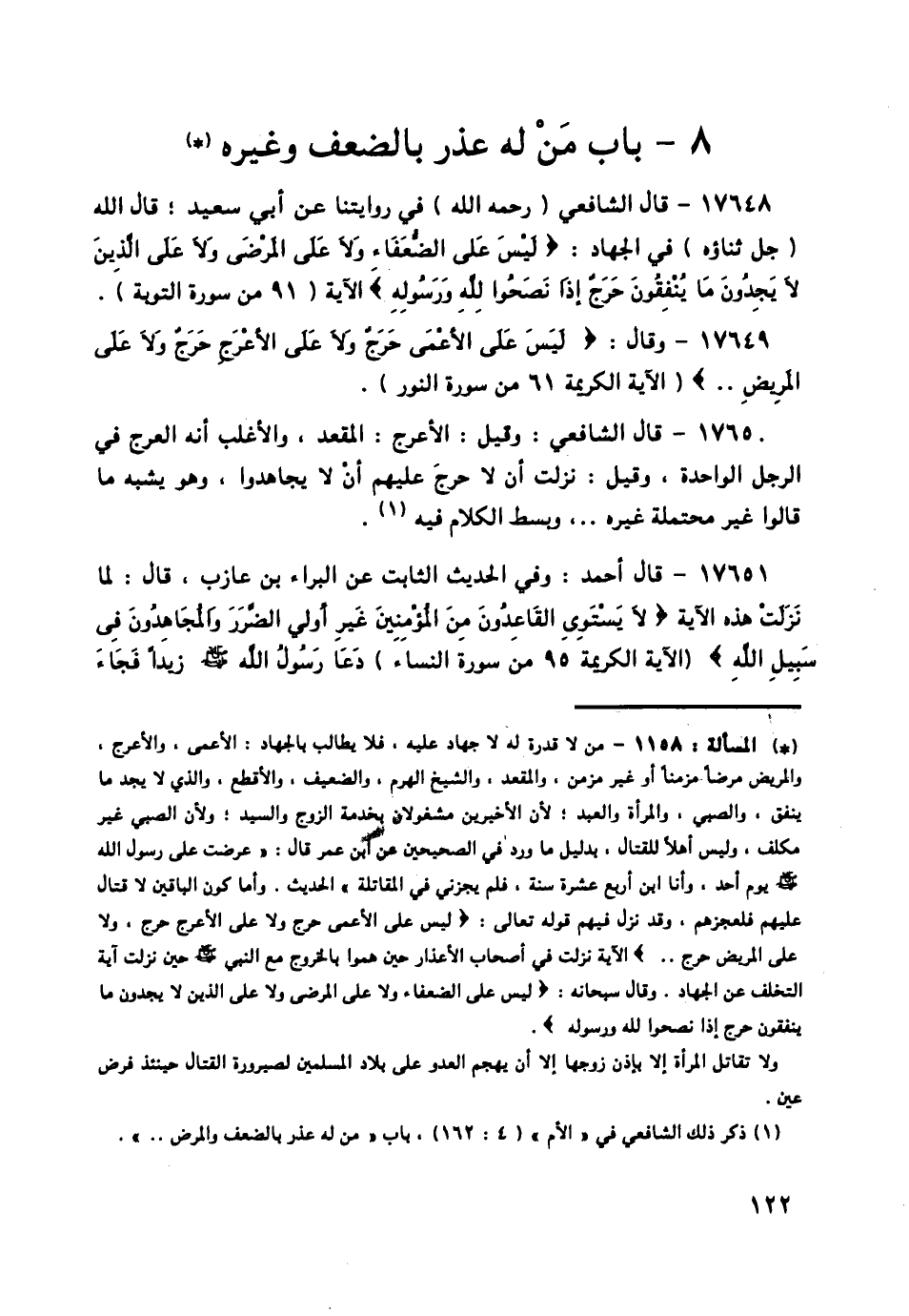 17650 - قَالَ الشَّافِعِيُّ: وَقِيلَ: الْأَعْرَجُ: الْمَقْعَدُ، وَالْأَغْلَبُ أَنَّهُ الْعَرَجُ فِي الرِّجْلِ الْوَاحِدَةِ، وَقِيلَ: نَزَلَتْ أَنْ لَا حَرَجَ عَلَيْهِمْ أَنْ لَا يُجَاهِدُوا، وَهُوَ يُشْبِهُ مَا قَالُوا غَيْرَ مُحْتَمِلَةٍ غَيْرَهُ، وَبَسَطَ الْكَلَامَ فِيهِ