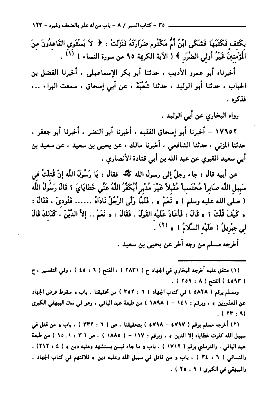 17652 - أَخْبَرَنَا أَبُو إِسْحَاقَ الْفَقِيهُ، أَخْبَرَنَا أَبُو النَّضْرِ، أَخْبَرَنَا أَبُو جَعْفَرٍ، حَدَّثَنَا الْمُزَنِيُّ، حَدَّثَنَا الشَّافِعِيُّ، أَخْبَرَنَا مَالِكٌ، عَنْ يَحْيَى بْنِ سَعِيدٍ، عَنْ سَعِيدِ بْنِ أَبِي سَعِيدٍ الْمَقْبُرِيُّ، عَنْ عَبْدِ اللَّهِ بْنِ أَبِي قَتَادَةَ الْأَنْصَارِيِّ، عَنْ أَبِيهِ قَالَ: جَاءَ رَجُلٌ إِلَى رَسُولِ اللَّهِ صَلَّى اللهُ عَلَيْهِ وَسَلَّمَ فَقَالَ: يَا رَسُولَ اللَّهِ، §إِنْ قُتِلْتُ فِي سَبِيلِ اللَّهِ صَابِرًا مُحْتَسِبًا مُقْبِلًا غَيْرَ مُدْبِرٍ أَيُكَفِّرُ اللَّهُ عَنِّي خَطَايَايَ؟ قَالَ رَسُولُ اللَّهِ صَلَّى اللهُ عَلَيْهِ وَسَلَّمَ: «نَعَمْ»، فَلَمَّا وَلَّى الرَّجُلُ نَادَاهُ 000 فَنُودِيَ فَقَالَ: «كَيْفَ قُلْتَ؟» قَالَ: فَأَعَادَ عَلَيْهِ الْقَوْلَ، فَقَالَ: «نَعَمْ، إِلَّا الدَّيْنَ، كَذَلِكَ قَالَ لِي جِبْرِيلُ عَلَيْهِ السَّلَامُ» أَخْرَجَهُ مُسْلِمٌ مِنْ وَجْهٍ آخَرَ عَنْ يَحْيَى بْنِ سَعِيدٍ