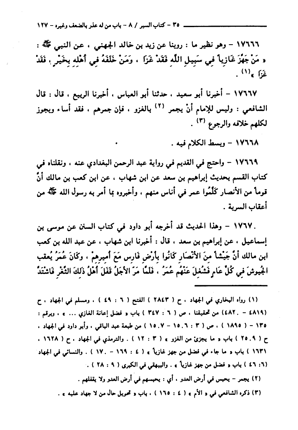 17667 - أَخْبَرَنَا أَبُو سَعِيدٍ، حَدَّثَنَا أَبُو الْعَبَّاسِ، أَخْبَرَنَا الرَّبِيعُ قَالَ: قَالَ الشَّافِعِيُّ: «§وَلَيْسَ لِلْإِمَامِ أَنْ يُجَمِّرَ بِالْغَزْوِ، فَإِنْ جَمَّرَهُمْ فَقَدْ أَسَاءَ، وَيَجُوزُ لِكُلِّهِمْ خِلَافُهُ وَالرُّجُوعُ»