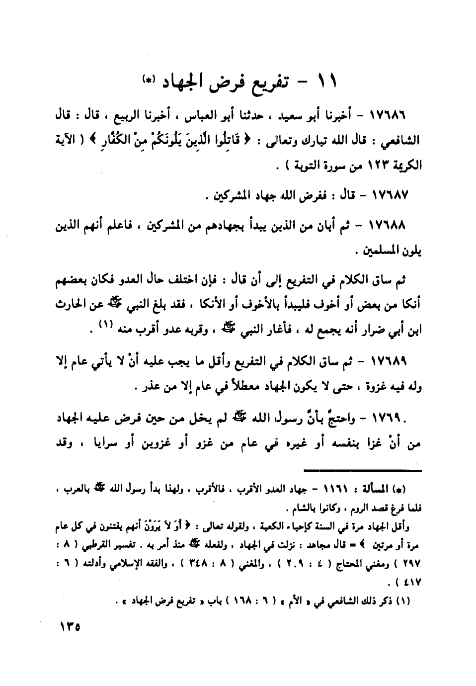 17688 - ثُمَّ أَبَانَ مَنِ الَّذِينَ يُبْدَأُ بِجِهَادِهِمْ مِنَ الْمُشْرِكِينَ، فَاعْلَمْ أَنَّهُمُ الَّذِينَ يَلُونَ الْمُسْلِمِينَ» ثُمَّ سَاقَ الْكَلَامَ فِي التَّفْرِيعِ إِلَى أَنْ قَالَ: فَإِنِ اخْتَلَفَ حَالُ الْعَدُوِّ فَكَانَ بَعْضُهُمْ أَنْكَا مِنْ بَعْضٍ، أَوْ أَخْوَفَ، فَلْيَبْدَأْ بِالْأَخْوَفِ أَوِ الْأَنْكَا، فَقَدْ بَلَغَ النَّبِيَّ صَلَّى اللهُ عَلَيْهِ وَسَلَّمَ عَنِ الْحَارِثِ بْنِ أَبِي ضِرَارٍ أَنَّهُ يَجْمَعُ لَهُ، فَأَغَارَ النَّبِيُّ صَلَّى اللهُ عَلَيْهِ وَسَلَّمَ وَقُرْبُهُ عَدُوٌّ أَقْرَبُ مِنْهُ