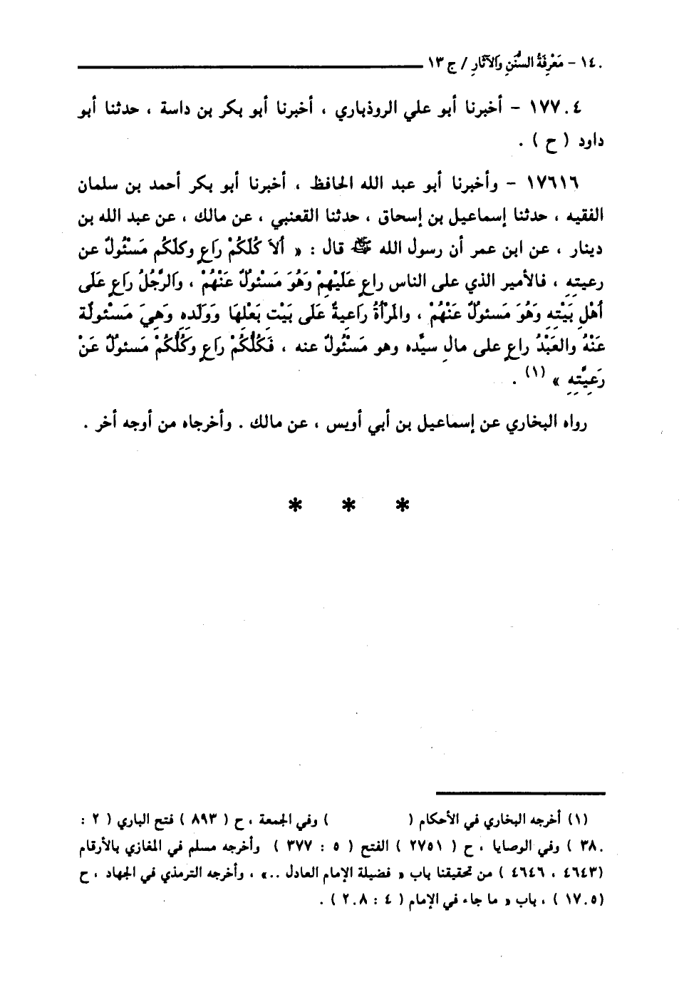 17706 - وَأَخْبَرَنَا أَبُو عَبْدِ اللَّهِ الْحَافِظُ، أَخْبَرَنَا أَبُو بَكْرٍ أَحْمَدُ بْنُ سَلْمَانَ الْفَقِيهُ، حَدَّثَنَا إِسْمَاعِيلُ بْنُ إِسْحَاقَ، حَدَّثَنَا الْقَعْنَبِيُّ، عَنْ مَالِكٍ، عَنْ عَبْدِ اللَّهِ بْنِ دِينَارٍ، عَنِ ابْنِ عُمَرَ، أَنَّ رَسُولَ اللَّهِ صَلَّى اللهُ عَلَيْهِ وَسَلَّمَ قَالَ: «§أَلَا كُلُّكُمْ رَاعٍ وَكُلُّكُمْ مَسْئُولٌ عَنْ رَعِيَّتِهِ، فَالْأَمِيرُ الَّذِي عَلَى النَّاسِ رَاعٍ عَلَيْهِمْ وَهُوَ مَسْئُولٌ عَنْهُمْ، وَالرَّجُلُ رَاعٍ عَلَى أَهْلِ بَيْتِهِ وَهُوَ مَسْئُولٌ عَنْهُمْ، وَالْمَرْأَةُ رَاعِيَةٌ عَلَى بَيْتِ بَعْلِهَا وَوَلَدِهِ وَهِيَ مَسْئُولَةٌ عَنْهُ، وَالْعَبْدُ رَاعٍ عَلَى مَالِ سَيِّدِهِ وَهُوَ مَسْئُولٌ عَنْهُ، فَكُلُّكُمْ رَاعٍ وَكُلُّكُمْ مَسْئُولٌ عَنْ رَعِيَّتِهِ» رَوَاهُ الْبُخَارِيُّ عَنْ إِسْمَاعِيلَ بْنِ أَبِي أُوَيْسٍ، عَنْ مَالِكٍ وَأَخْرَجَاهُ مِنْ أَوْجُهٍ أُخَرَ