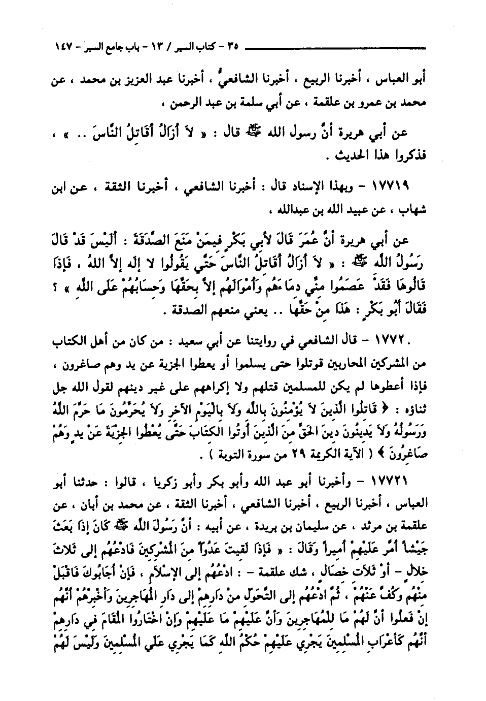 17721 - وَأَخْبَرَنَا أَبُو عَبْدِ اللَّهِ، وَأَبُو بَكْرٍ، وَأَبُو زَكَرِيَّا، قَالُوا: حَدَّثَنَا أَبُو الْعَبَّاسِ، أَخْبَرَنَا الرَّبِيعُ، أَخْبَرَنَا الشَّافِعِيُّ، أَخْبَرَنَا الثِّقَةُ، عَنْ مُحَمَّدِ بْنِ أَبَانَ، عَنْ عَلْقَمَةَ بْنِ مَرْثَدٍ، عَنْ سُلَيْمَانَ بْنِ بُرَيْدَةَ، عَنْ أَبِيهِ، أَنَّ رَسُولَ اللَّهِ صَلَّى اللهُ عَلَيْهِ وَسَلَّمَ كَانَ إِذَا بَعَثَ جَيْشًا أَمَّرَ عَلَيْهِمْ أَمِيرًا وَقَالَ: §" فَإِذَا لَقِيتَ عَدُوًّا مِنَ الْمُشْرِكِينَ فَادْعُهُمْ إِلَى ثَلَاثِ خِلَالٍ - أَوْ ثَلَاثِ خِصَالٍ، شَكَّ عَلْقَمَةُ -: ادْعُهُمْ إِلَى الْإِسْلَامِ، فَإِنْ أَجَابُوكَ فَاقْبَلْ مِنْهُمْ وَكُفَّ عَنْهُمْ، ثُمَّ ادْعُهُمْ إِلَى التَّحَوُّلِ مِنْ دَارِهِمْ إِلَى دَارِ الْمُهَاجِرِينَ وَأَخْبِرْهُمْ أَنَّهُمْ إِنْ فَعَلُوا أَنَّ لَهُمُ مَا لِلْمُهَاجِرِينَ وَأَنَّ عَلَيْهِمْ مَا عَلَيْهِمْ، وَإِنِ اخْتَارُوا الْمُقَامَ فِي دَارِهِمْ أَنَّهُمْ كَأَعْرَابِ الْمُسْلِمِينَ يَجْرِي عَلَيْهِمْ حُكْمُ اللَّهِ كَمَا يَجْرِي عَلَى الْمُسْلِمِينَ وَلَيْسَ لَهُمْ -[148]- فِي الْفَيْءِ شَيْءٌ إِلَّا أَنْ يُجَاهِدُوا مَعَ الْمُسْلِمِينَ، فَإِنْ لَمْ يُجِيبُوكَ إِلَى الْإِسْلَامِ فَادْعُهُمْ إِلَى أَنْ يُعْطُوا الْجِزْيَةَ، فَإِنْ فَعَلُوا فَاقْبَلْ مِنْهُمْ وَدَعْهُمْ، وَإِنْ أَبَوْا فَاسْتَعِنْ بِاللَّهِ وَقَاتِلْهُمْ " أَخْرَجَهُ مُسْلِمٌ فِي الصَّحِيحِ مِنْ حَدِيثِ سُفْيَانَ الثَّوْرِيِّ وَشُعْبَةَ، عَنْ عَلْقَمَةَ وَحَدِيثُ أَبِي هُرَيْرَةَ فِي قِصَّةِ أَبِي بَكْرٍ وَعُمَرَ قَدْ أَخْرَجَاهُ كَمَا مَضَى