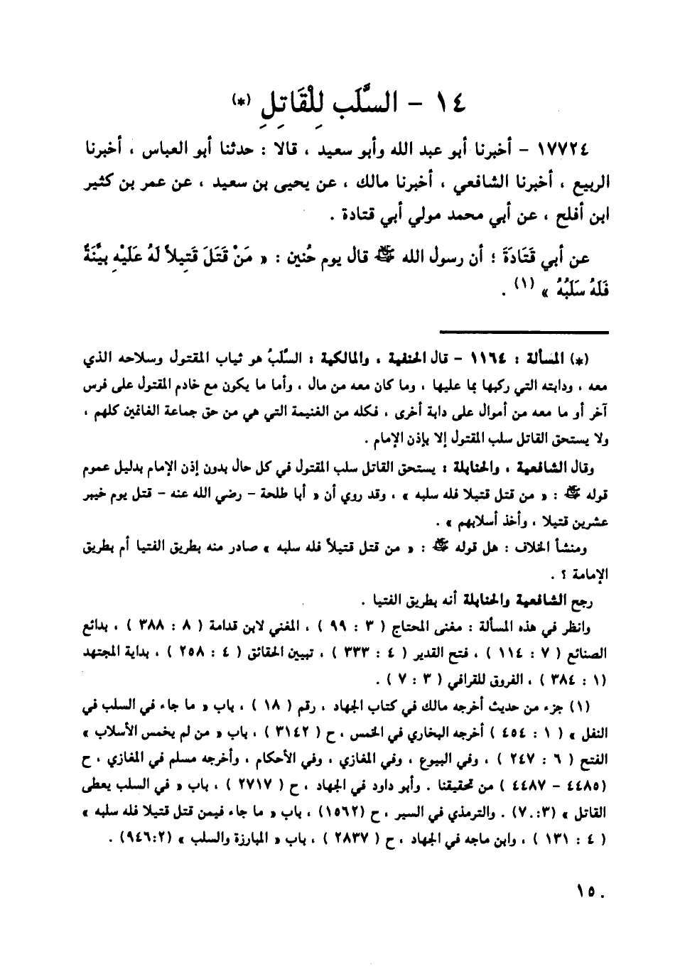 17725 - قَالَ الشَّافِعِيُّ: وَهَذَا حَدِيثٌ ثَابِتٌ صَحِيحٌ لَا مُخَالِفَ لَهُ عَلِمْتُهُ عَنْ رَسُولِ اللَّهِ صَلَّى اللهُ عَلَيْهِ وَسَلَّمَ، وَفِيهِ دَلَالَةٌ عَلَى أَنَّ رَسُولَ اللَّهِ صَلَّى اللهُ عَلَيْهِ وَسَلَّمَ إِنَّمَا قَالَهُ بَعْدَ نَقْضِ الْحَرْبِ لِأَنَّهُ وَجَدَ سَلَبَ قَتِيلِ أَبِي قَتَادَةَ فِي يَدَيْ رَجُلٍ فَأَخْرَجَهُ مِنْ يَدِهِ، وَقَدْ قَالَهُ رَسُولُ اللَّهِ صَلَّى اللهُ عَلَيْهِ وَسَلَّمَ يَوْمَ حُنَيْنٍ، وَفِي غَيْرِ يَوْمٍ مِنْ مَغَازِيهِ، وَقَالَهُ مَنْ بَعْدَهُ مِنَ الْأَئِمَّةَ