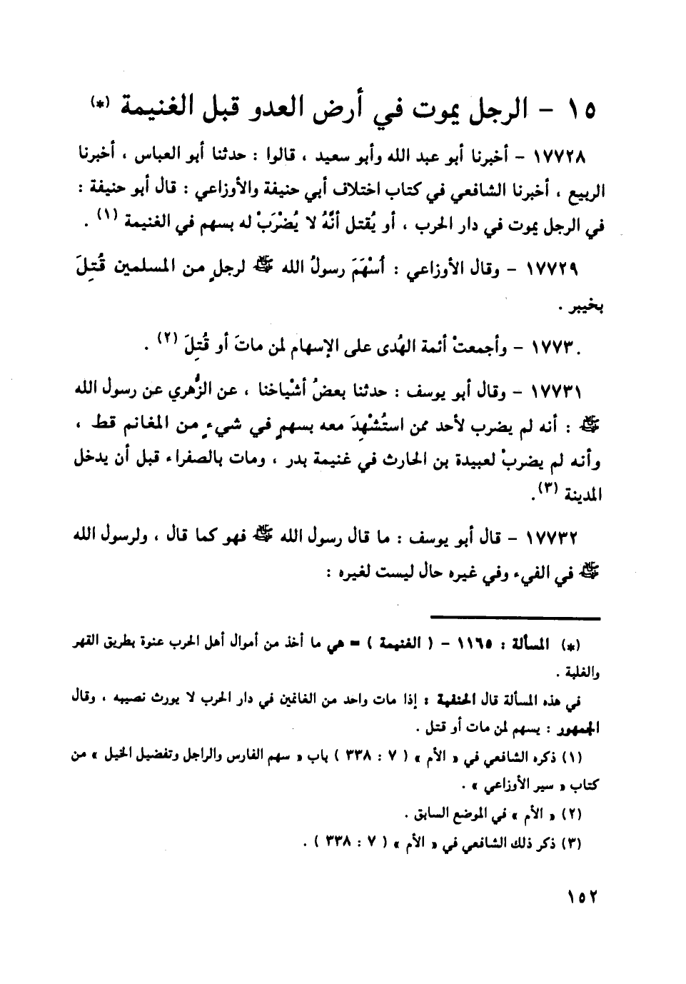 17728 - أَخْبَرَنَا أَبُو عَبْدِ اللَّهِ، وَأَبُو سَعِيدٍ، قَالُوا: حَدَّثَنَا أَبُو الْعَبَّاسِ، أَخْبَرَنَا الرَّبِيعُ، أَخْبَرَنَا الشَّافِعِيُّ فِي كِتَابِ اخْتِلَافِ أَبِي حَنِيفَةَ وَالْأَوْزَاعِيِّ، قَالَ أَبُو حَنِيفَةَ: «فِي §الرَّجُلِ يَمُوتُ فِي دَارِ الْحَرْبِ، أَوْ يُقْتَلُ، إِنَّهُ لَا يُضْرَبُ لَهُ بِسَهْمٍ فِي الْغَنِيمَةِ»