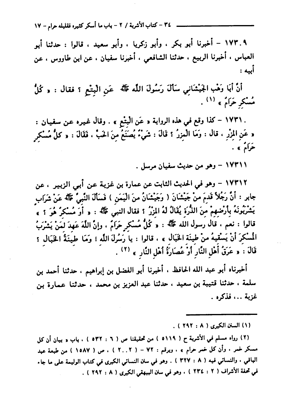 17309 - أَخْبَرَنَا أَبُو بَكْرٍ، وَأَبُو زَكَرِيَّا، وَأَبُو سَعِيدٍ، قَالُوا: حَدَّثَنَا أَبُو الْعَبَّاسِ، أَخْبَرَنَا الرَّبِيعُ، حَدَّثَنَا الشَّافِعِيُّ، أَخْبَرَنَا سُفْيَانُ، عَنِ ابْنِ طَاوُسٍ، عَنْ أَبِيهِ، أَنَّ أَبَا وَهْبٍ الْجَيْشَانِيَّ، سَأَلَ رَسُولَ اللَّهِ صَلَّى اللهُ عَلَيْهِ وَسَلَّمَ عَنِ الْبِتْعِ، فَقَالَ: «§كُلُّ مُسْكِرٍ حَرَامٌ»