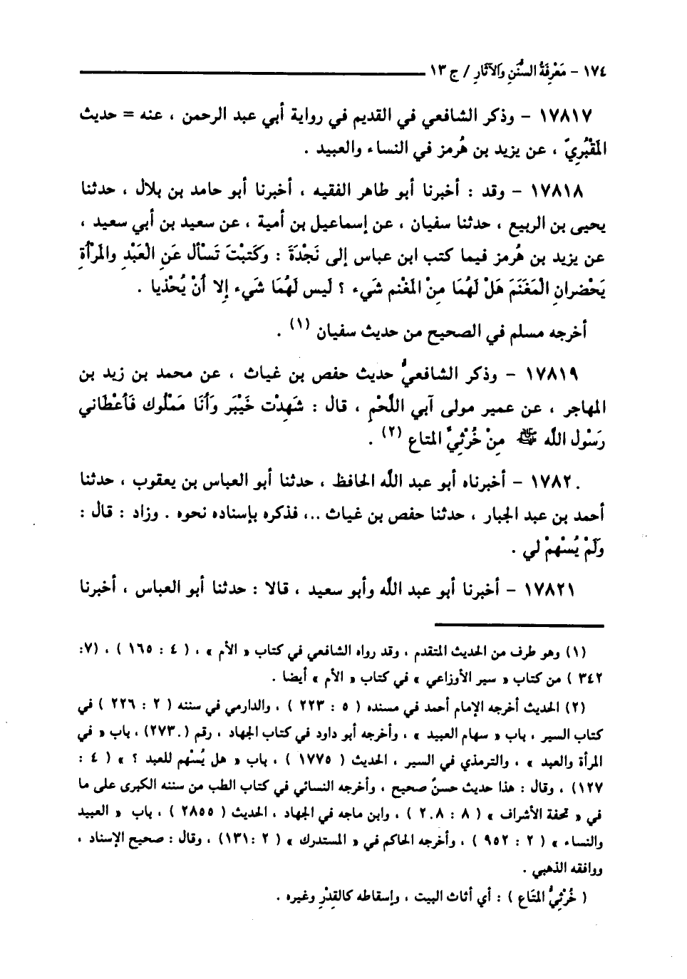 17818 - وَقَدْ: أَخْبَرَنَا أَبُو طَاهِرٍ الْفَقِيهُ، أَخْبَرَنَا أَبُو حَامِدِ بْنُ بِلَالٍ، حَدَّثَنَا يَحْيَى بْنُ الرَّبِيعِ، حَدَّثَنَا سُفْيَانُ، عَنْ إِسْمَاعِيلَ بْنِ أُمَيَّةَ، عَنْ سَعِيدِ بْنِ أَبِي سَعِيدٍ، عَنْ يَزِيدَ بْنِ هُرْمُزَ، فِيمَا كَتَبَ ابْنُ عَبَّاسٍ إِلَى نَجْدَةَ: «وَكَتَبْتَ تَسْأَلُ عَنِ §الْعَبْدِ وَالْمَرْأَةِ يَحْضُرَانِ الْمَغْنَمَ، هَلْ لَهُمَا مِنَ الْمَغْنَمِ شَيْءٌ؟ لَيْسَ لَهُمَا شَيْءٌ إِلَّا أَنْ يُحْذَيَا» أَخْرَجَهُ مُسْلِمٌ فِي الصَّحِيحِ مِنْ حَدِيثِ سُفْيَانَ