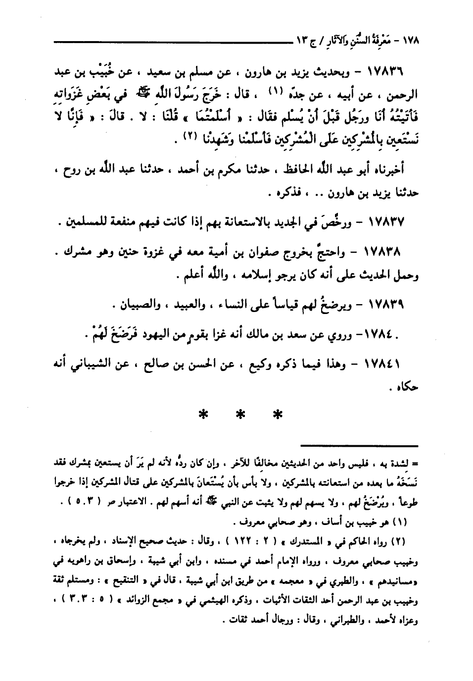 17836 - وَبِحَدِيثِ يَزِيدَ بْنِ هَارُونَ، عَنْ مُسْلِمِ بْنِ سَعِيدٍ، عَنْ خُبَيْبِ بْنِ عَبْدِ الرَّحْمَنِ، عَنْ أَبِيهِ، عَنْ جَدِّهِ قَالَ: خَرَجَ رَسُولُ اللَّهِ صَلَّى اللهُ عَلَيْهِ وَسَلَّمَ فِي بَعْضِ غَزَوَاتِهِ فَأَتَيْتُهُ أَنَا وَرَجُلٌ قَبْلَ أَنْ يُسْلِمَ فَقَالَ: «أَسْلَمْتُمَا؟» قُلْنَا: لَا قَالَ: «§فَإِنَّا لَا نَسْتَعِينُ بِالْمُشْرِكِينَ عَلَى الْمُشْرِكِينَ»، فَأَسْلَمْنَا وَشَهِدْنَا أَخْبَرَنَاهُ أَبُو عَبْدِ اللَّهِ الْحَافِظُ، حَدَّثَنَا مُكْرَمُ بْنُ أَحْمَدَ، حَدَّثَنَا عَبْدُ اللَّهِ بْنُ رَوْحٍ، حَدَّثَنَا يَزِيدُ بْنُ هَارُونَ فَذَكَرَهُ