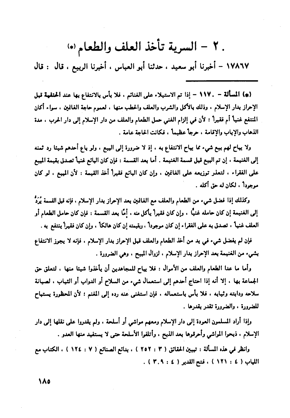 17868 - وَكَانَ الطَّعَامُ دَاخِلًا فِي مَعْنَى أَمْوَالِ الْمُشْرِكِينَ، وَأَكْثَرُ مِنَ الْخَيْطِ وَالْمَخِيطِ وَالْفِلْسِ وَالْخَرَزَةِ الَّتِي لَا يَحِلُّ أَخْذَهَا لِأَحَدٍ دُونَ أَحَدٍ، فَلَمَّا أَذِنَ رَسُولُ اللَّهِ صَلَّى اللهُ عَلَيْهِ وَسَلَّمَ فِي بِلَادِ الْحَرْبِ فِي الطَّعَامِ، كَانَ الْإِذْنُ فِيهِ خَاصًّا خَارِجًا مِنَ الْجُمْلَةِ الَّتِي اسْتَثْنَى