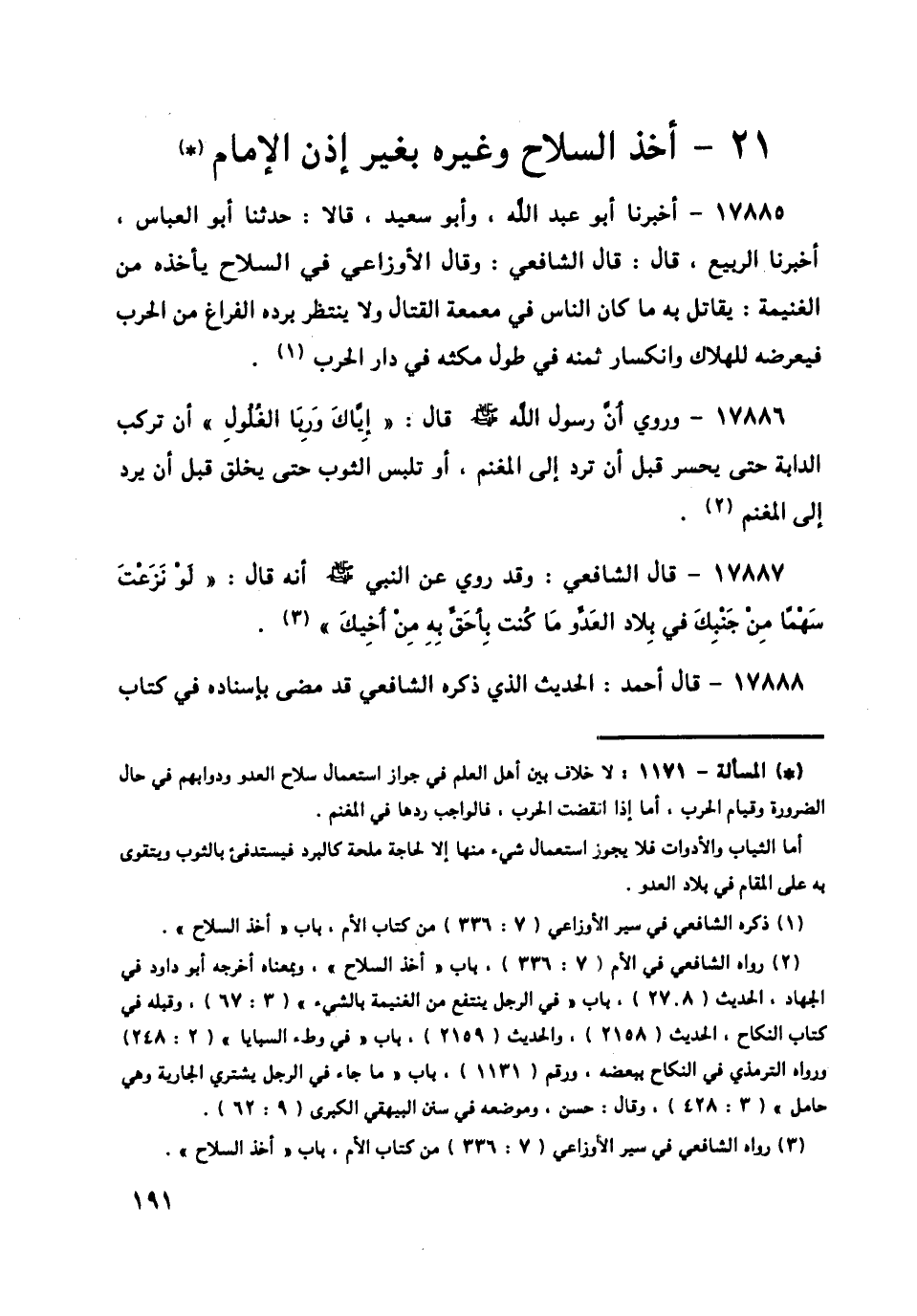 17885 - أَخْبَرَنَا أَبُو عَبْدِ اللَّهِ، وَأَبُو سَعِيدٍ قَالَا: حَدَّثَنَا أَبُو الْعَبَّاسِ، أَخْبَرَنَا الرَّبِيعُ قَالَ: قَالَ الشَّافِعِيُّ: وَقَالَ الْأَوْزَاعِيُّ فِي §السِّلَاحِ يَأْخُذُهُ مِنَ الْغَنِيمَةِ: «يُقَاتِلُ بِهِ مَا كَانَ النَّاسُ فِي مَعْمَعَةِ الْقِتَالِ، وَلَا يَنْتَظِرُ بِرَدِّهِ الْفَرَاغَ مِنَ الْحَرْبِ فَيُعَرِّضَهُ لِلْهَلَاكِ وَانْكِسَارِ ثَمَنِهِ فِي طُولِ مُكْثِهِ فِي دَارِ الْحَرْبِ»