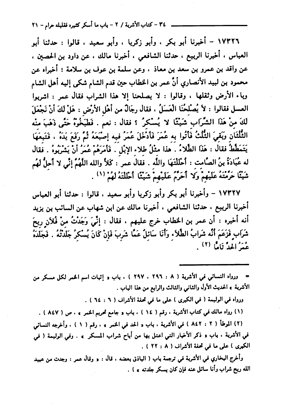 17326 - أَخْبَرَنَا أَبُو بَكْرٍ، وَأَبُو زَكَرِيَّا، وَأَبُو سَعِيدٍ، قَالُوا: حَدَّثَنَا أَبُو الْعَبَّاسِ، أَخْبَرَنَا الرَّبِيعُ، حَدَّثَنَا الشَّافِعِيُّ، أَخْبَرَنَا مَالِكٌ، عَنْ دَاوُدَ بْنِ الْحُصَيْنِ، عَنْ وَاقِدِ بْنِ عَمْرِو بْنِ سَعْدِ بْنِ مُعَاذٍ، وَعَنْ سَلَمَةَ بْنِ عَوْفِ بْنِ سَلَامَةَ، أَخْبَرَاهُ، عَنْ مَحْمُودِ بْنِ لَبِيدٍ الْأَنْصَارِيِّ، أَنَّ عُمَرَ بْنَ الْخَطَّابِ، حِينَ قَدِمَ الشَّامَ شَكَى إِلَيْهِ أَهْلُ الشَّامِ وَبَاءَ الْأَرْضِ وَثِقَلَهَا وَقَالُوا: لَا يُصْلِحُنَا إِلَّا هَذَا الشَّرَابُ، فَقَالَ عُمَرُ: اشْرَبُوا الْعَسَلَ، فَقَالُوا: لَا يُصْلِحُنَا الْعَسَلُ، فَقَالَ رِجَالٌ مِنْ أَهْلِ الْأَرْضِ: هَلْ لَكَ أَنْ نَجْعَلَ لَكَ مِنْ هَذَا الشَّرَابِ شَيْئًا لَا يُسْكِرُ؟ فَقَالَ: نَعَمْ، فَطَبَخُوهُ حَتَّى ذَهَبَ مِنْهُ الثُّلُثَانِ وَبَقِيَ الثُّلُثُ، فَأَتَوْا بِهِ عُمَرَ فَأَدْخَلَ عُمَرُ فِيهِ إِصْبَعَهُ، ثُمَّ رَفَعَ يَدَهُ فَتَبِعَهَا يَتَمَطَّطُ، فَقَالَ: هَذَا الطِّلَاءُ، هَذَا مِثْلُ طِلَاءِ الْإِبِلِ، فَأَمَرَهُمْ عُمَرُ أَنْ يَشْرَبُوهُ، فَقَالَ لَهُ عُبَادَةُ بْنُ الصَّامِتِ: أَحْلَلْتَهَا وَاللَّهِ، فَقَالَ عُمَرُ: «كَلَّا وَاللَّهِ، §اللَّهُمَّ إِنِّي لَا أُحِلُّ لَهُمْ شَيْئًا حَرَّمْتَهُ عَلَيْهِمْ، وَلَا أُحَرِّمُ عَلَيْهِمْ شَيْئًا أَحْلَلْتَهُ لَهُمْ»