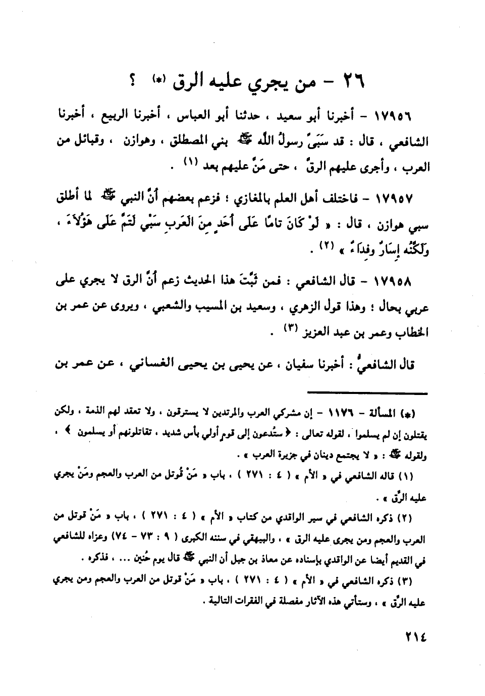 17956 - أَخْبَرَنَا أَبُو سَعِيدٍ، حَدَّثَنَا أَبُو الْعَبَّاسِ، أَخْبَرَنَا الرَّبِيعُ، أَخْبَرَنَا الشَّافِعِيُّ قَالَ: قَدْ §سَبَى رَسُولُ اللَّهِ صَلَّى اللهُ عَلَيْهِ وَسَلَّمَ بَنِي الْمُصْطَلِقِ وَهَوَازِنَ وَقَبَائِلَ مِنَ الْعَرَبِ، وَأَجْرَى عَلَيْهِمُ الرِّقَّ حَتَّى مَنَّ عَلَيْهِمْ بَعْدُ