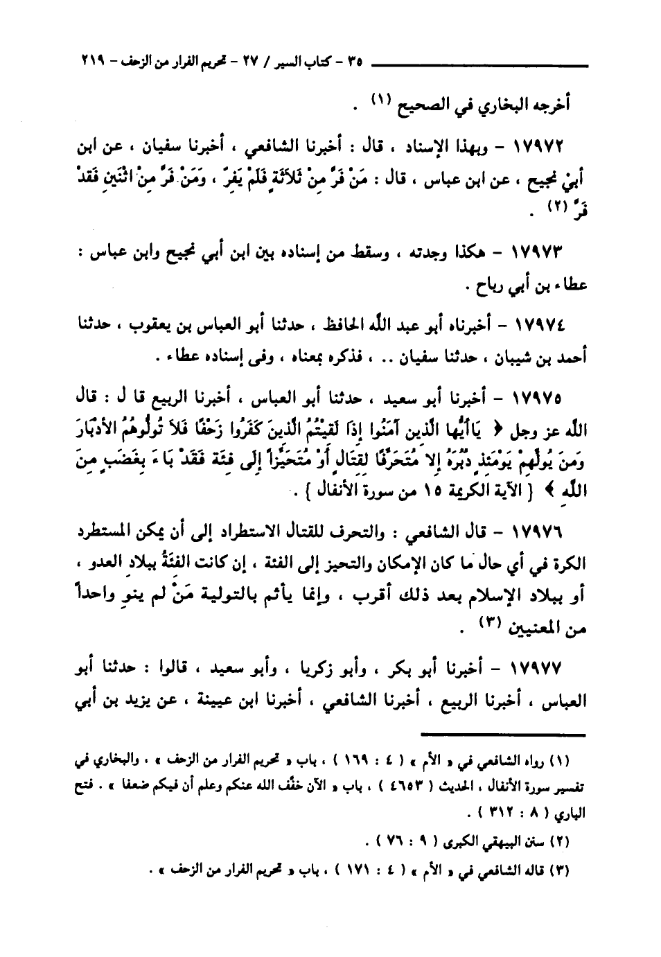 17972 - وَبِهَذَا الْإِسْنَادِ قَالَ: أَخْبَرَنَا الشَّافِعِيُّ، أَخْبَرَنَا سُفْيَانُ، عَنِ ابْنِ أَبِي نَجِيحٍ، عَنِ ابْنِ عَبَّاسٍ قَالَ: «§مَنْ فَرَّ مِنْ ثَلَاثَةٍ فَلَمْ يَفِرَّ، وَمَنْ فَرَّ مِنَ اثْنَيْنِ فَقَدْ فَرَّ»