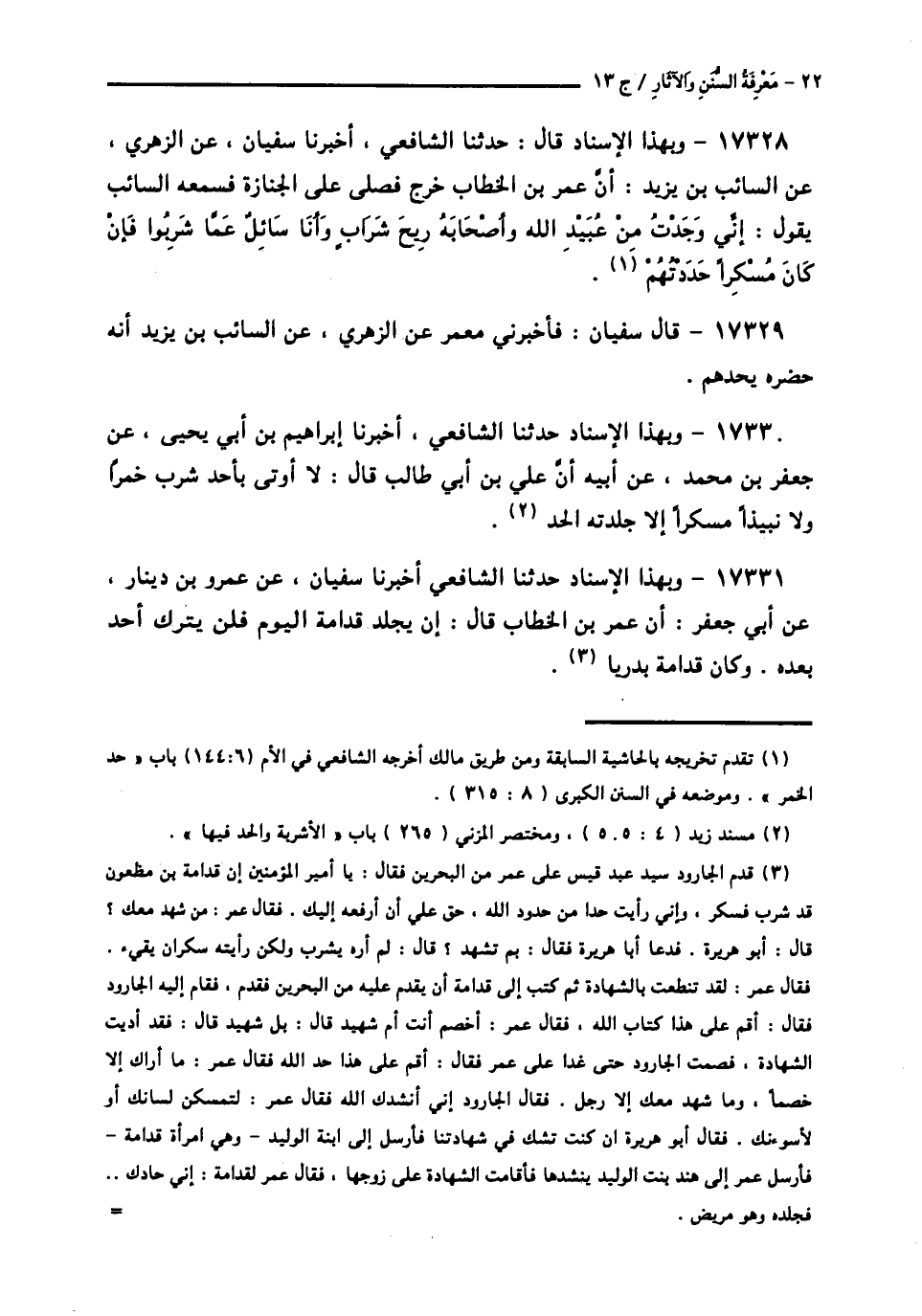 17329 - قَالَ سُفْيَانُ: فَأَخْبَرَنِي مَعْمَرٌ، عَنِ الزُّهْرِيِّ، عَنِ السَّائِبِ بْنِ يَزِيدَ، أَنَّهُ حَضَرَهُ يَحُدُّهُمْ