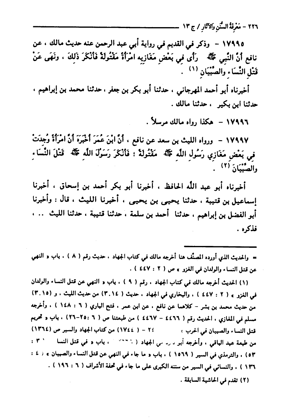 17995 - وَذَكَرَ فِي الْقَدِيمِ فِي رِوَايَةِ أَبِي عَبْدِ الرَّحْمَنِ عَنْهُ حَدِيثَ مَالِكٍ، عَنْ نَافِعٍ، «أَنَّ النَّبِيَّ صَلَّى اللهُ عَلَيْهِ وَسَلَّمَ رَأَى فِي بَعْضِ مَغَازِيهِ امْرَأَةً مَقْتُولَةً فَأَنْكَرَ ذَلِكَ §وَنَهَى عَنْ قَتْلِ النِّسَاءِ وَالصِّبْيَانِ» أَخْبَرَنَاهُ أَبُو أَحْمَدَ الْمِهْرَجَانِيُّ، حَدَّثَنَا أَبُو بَكْرِ بْنُ جَعْفَرٍ، حَدَّثَنَا مُحَمَّدُ بْنُ إِبْرَاهِيمَ، حَدَّثَنَا ابْنُ بُكَيْرٍ، حَدَّثَنَا مَالِكٌ