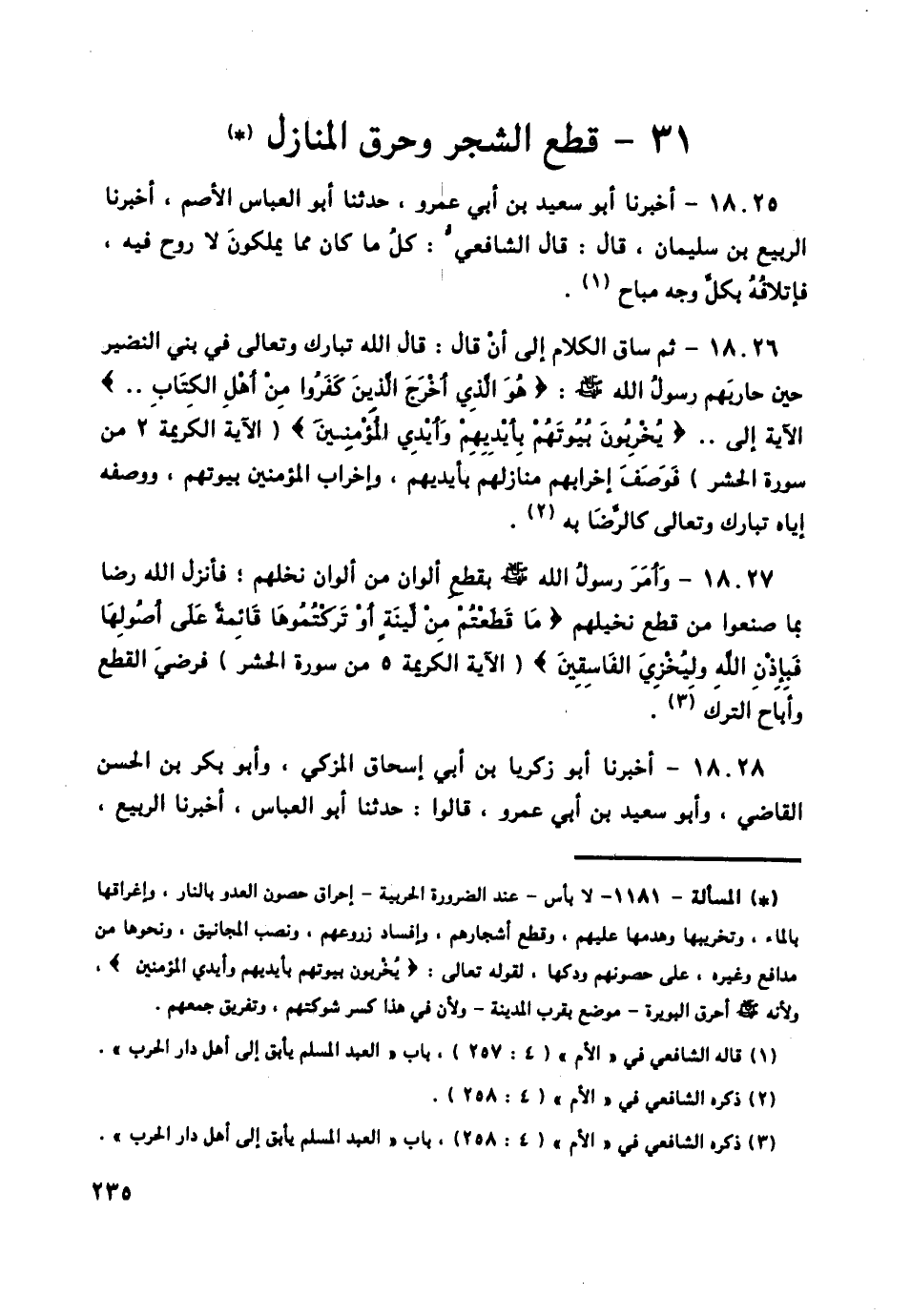 18026 - ثُمَّ سَاقَ الْكَلَامَ إِلَى أَنْ قَالَ: قَالَ اللَّهُ تَبَارَكَ وَتَعَالَى فِي بَنِي النَّضِيرِ حِينَ حَارَبَهُمْ رَسُولُ اللَّهِ صَلَّى اللهُ عَلَيْهِ وَسَلَّمَ: {هُوَ الَّذِي أَخْرَجَ الَّذِينَ كَفَرُوا مِنْ أَهْلِ الْكِتَابِ} [الحشر: 2] الْآيَةَ إِلَى {يُخْرِبُونَ بُيُوتَهُمْ بِأَيْدِيهِمْ وَأَيْدِي الْمُؤْمِنِينَ} [الحشر: 2]، فَوَصَفَ إِخْرَابَهُمْ مَنَازِلَهُمْ بِأَيْدِيهِمْ، وَإِخْرَابَ الْمُؤْمِنِينَ بُيُوتَهُمْ، وَوَصْفُهُ إِيَّاهُ تَبَارَكَ وَتَعَالَى كَالرِّضَا بِهِ §"
