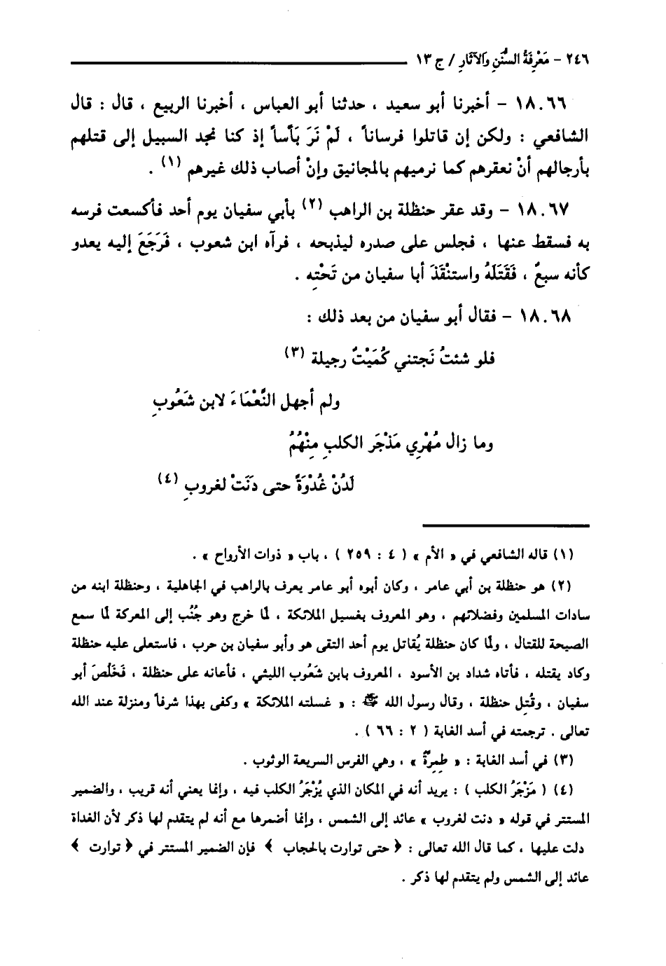 18067 - وَقَدْ عَقَرَ حَنْظَلَةُ بْنُ الرَّاهِبِ بِأَبِي سُفْيَانَ يَوْمَ أُحُدٍ فَأَكْسَعَتْ فَرَسُهُ بِهِ فَسَقَطَ عَنْهَا، فَجَلَسَ عَلَى صَدْرِهِ لِيَذْبَحَهُ فَرَآهُ ابْنُ شَعْوَبٍ، فَرَجَعَ إِلَيْهِ يَعْدُو كَأَنَّهُ سَبْعٌ فَقَتَلَهُ وَاسْتَنْقَذَ أَبَا سُفْيَانَ مِنْ تَحْتِهِ