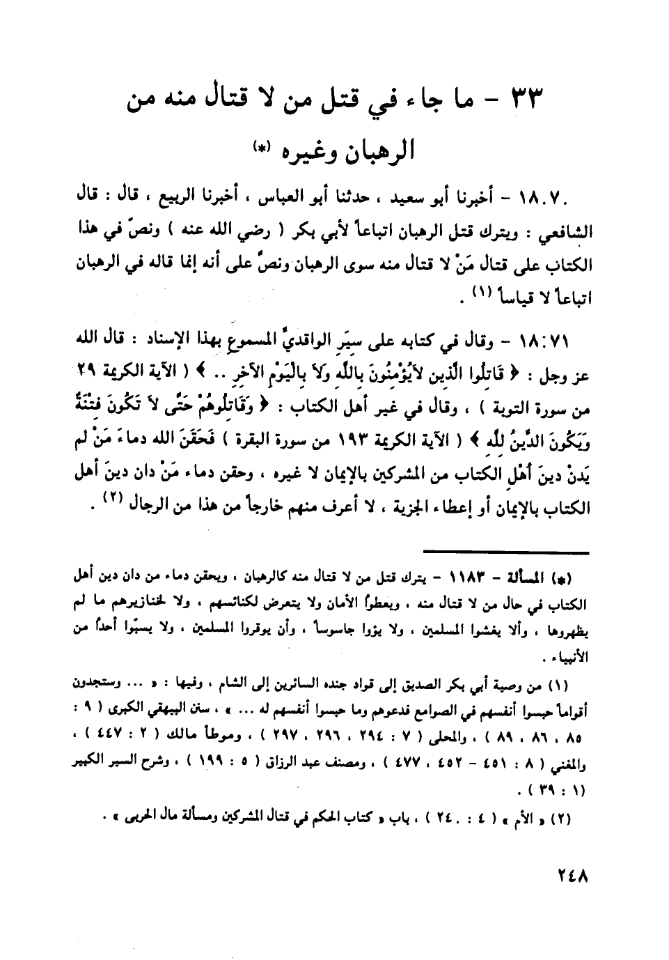 18070 - أَخْبَرَنَا أَبُو سَعِيدٍ، حَدَّثَنَا أَبُو الْعَبَّاسِ، أَخْبَرَنَا الرَّبِيعُ قَالَ: قَالَ الشَّافِعِيُّ: § «وَيُتْرَكُ قَتْلُ الرُّهْبَانِ اتِّبَاعًا لِأَبِي بَكْرٍ رَضِيَ اللَّهُ عَنْهُ» وَنَصَّ فِي هَذَا الْكِتَابِ عَلَى قِتَالِ مَنْ لَا قِتَالَ مِنْهُ سِوَى الرُّهْبَانِ، وَنَصَّ عَلَى أَنَّهُ إِنَّمَا قَالَهُ فِي الرُّهْبَانِ اتِّبَاعًا لَا قِيَاسًا.