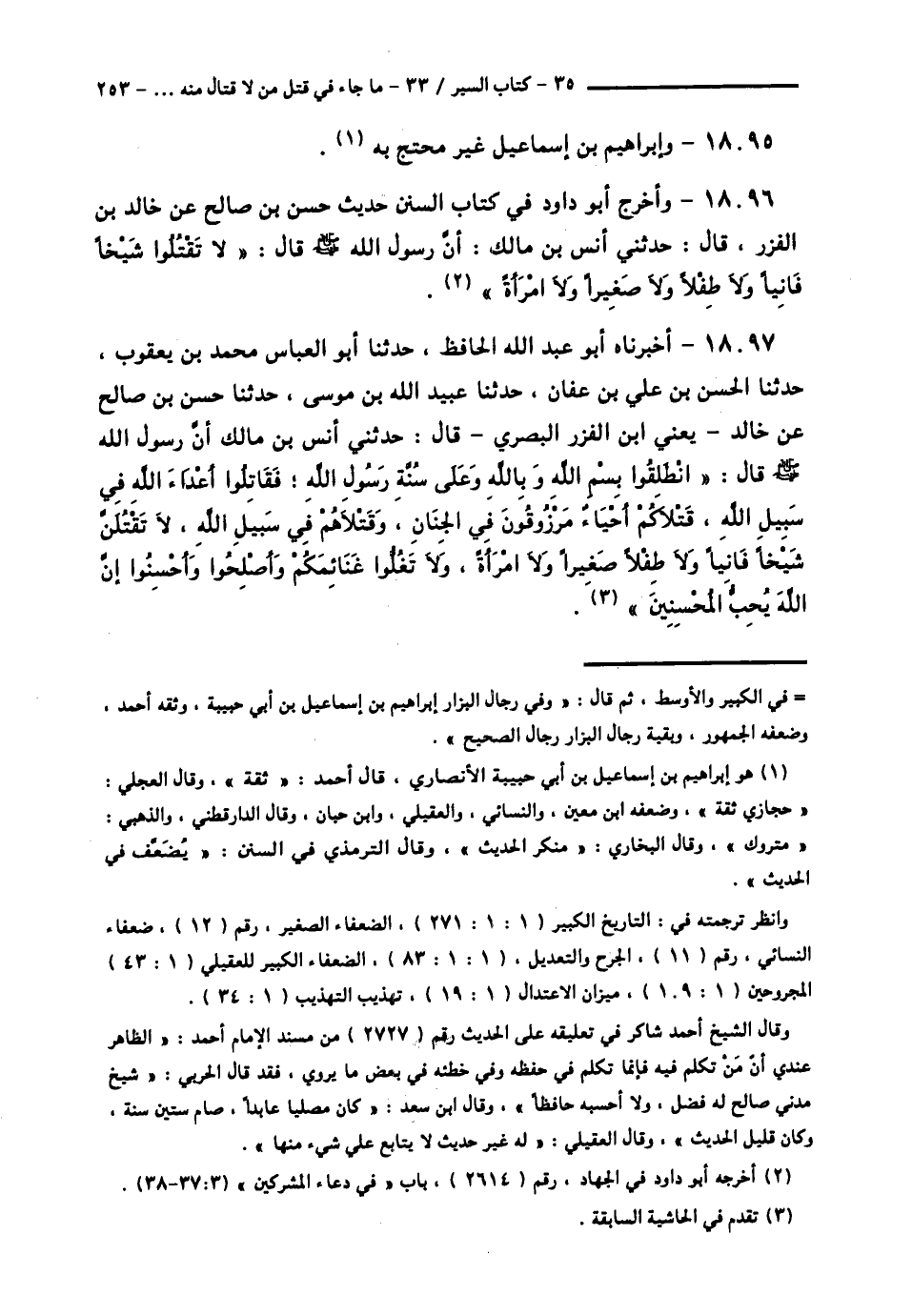 18097 - أَخْبَرَنَاهُ أَبُو عَبْدِ اللَّهِ الْحَافِظُ، حَدَّثَنَا أَبُو الْعَبَّاسِ مُحَمَّدُ بْنُ يَعْقُوبَ، حَدَّثَنَا الْحَسَنُ بْنُ عَلِيِّ بْنِ عَفَّانَ، حَدَّثَنَا عُبَيْدُ اللَّهِ بْنُ مُوسَى، حَدَّثَنَا حَسَنُ بْنُ صَالِحٍ، عَنْ خَالِدٍ - يَعْنِي ابْنَ الْفِزْرِ الْبَصْرِيَّ - قَالَ: حَدَّثَنِي أَنَسُ بْنُ مَالِكٍ، أَنَّ رَسُولَ اللَّهِ صَلَّى اللهُ عَلَيْهِ وَسَلَّمَ قَالَ: «§انْطَلِقُوا بِسْمِ اللَّهِ، وَبِاللَّهِ، وَعَلَى سُنَّةِ رَسُولِ اللَّهِ، فَقَاتِلُوا أَعْدَاءَ اللَّهِ فِي سَبِيلِ اللَّهِ، قَتْلَاكُمْ أَحْيَاءٌ مُرْزَقُونَ فِي الْجِنَانِ، وَقَتْلَاهُمْ فِي سَبِيلِ اللَّهِ، لَا تَقْتُلُنَّ شَيْخًا فَانِيًا، وَلَا طِفْلًا صَغِيرًا، وَلَا امْرَأَةً، وَلَا تَغُلُّوا غَنَائِمَكُمْ، وَأَصْلِحُوا وَأَحْسِنُوا، إِنَّ اللَّهَ يُحِبُّ الْمُحْسِنِينَ»