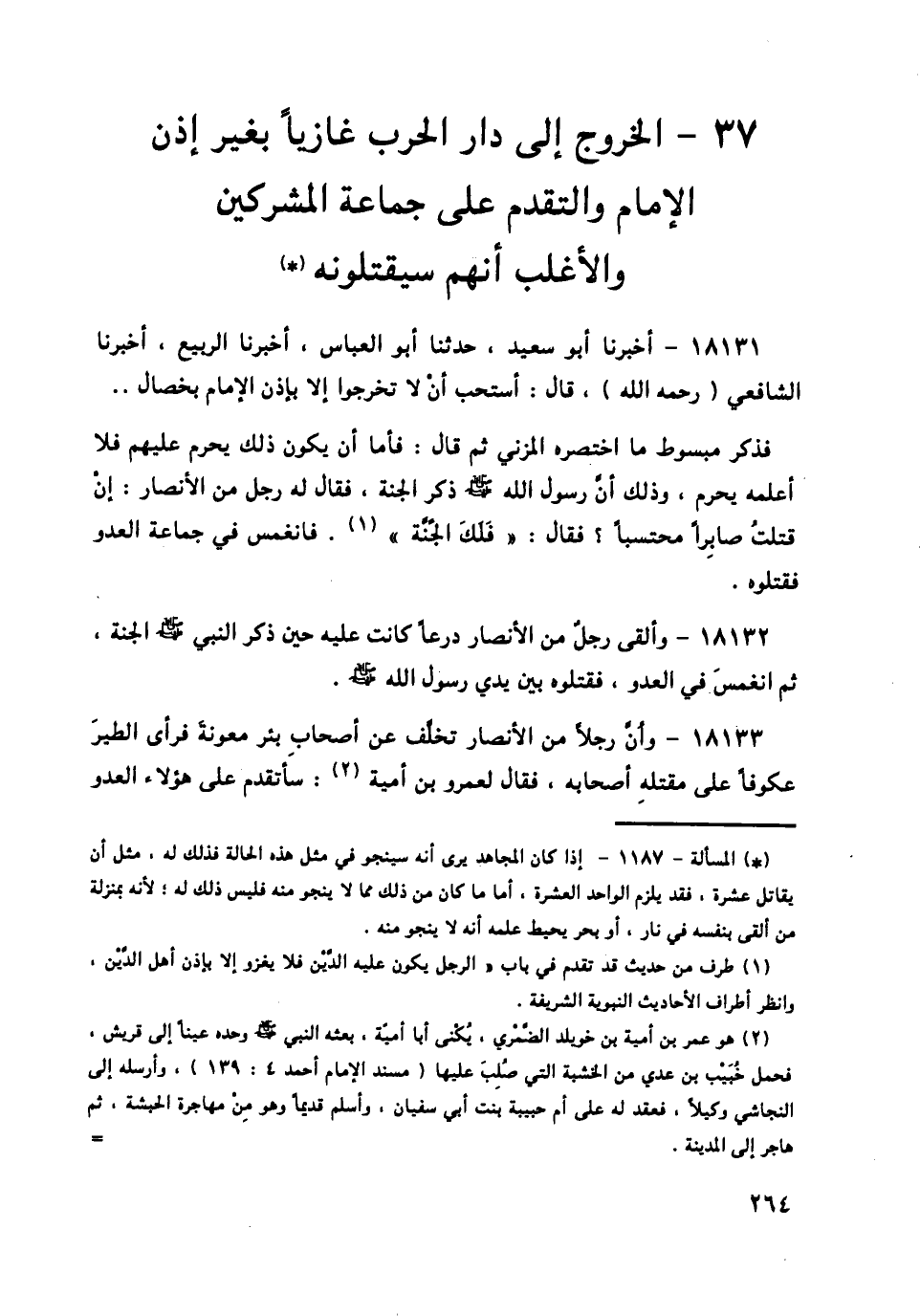 18131 - أَخْبَرَنَا أَبُو سَعِيدٍ، حَدَّثَنَا أَبُو الْعَبَّاسِ، أَخْبَرَنَا الرَّبِيعُ، أَخْبَرَنَا الشَّافِعِيُّ رَحِمَهُ اللَّهُ قَالَ: §" أَسْتَحِبُّ أَنْ لَا تَخْرُجُوا إِلَّا بِإِذْنِ الْإِمَامِ بِخِصَالٍ فَذَكَرَ مَبْسُوطَ مَا اخْتَصَرَهُ الْمُزَنِيُّ ثُمَّ قَالَ: فَأَمَّا أَنْ يَكُونَ ذَلِكَ يَحْرُمُ عَلَيْهِمْ فَلَا أَعْلَمُهُ يَحْرُمُ، وَذَلِكَ أَنَّ رَسُولَ اللَّهِ صَلَّى اللهُ عَلَيْهِ وَسَلَّمَ ذَكَرَ الْجَنَّةَ فَقَالَ لَهُ رَجُلٌ مِنَ الْأَنْصَارِ: إِنْ قُتِلْتُ صَابِرًا مُحْتَسِبًا؟ فَقَالَ: «فَلَكَ الْجَنَّةُ»، فَانْغَمَسَ فِي جَمَاعَةِ الْعَدُوِّ فَقَتَلُوهُ.