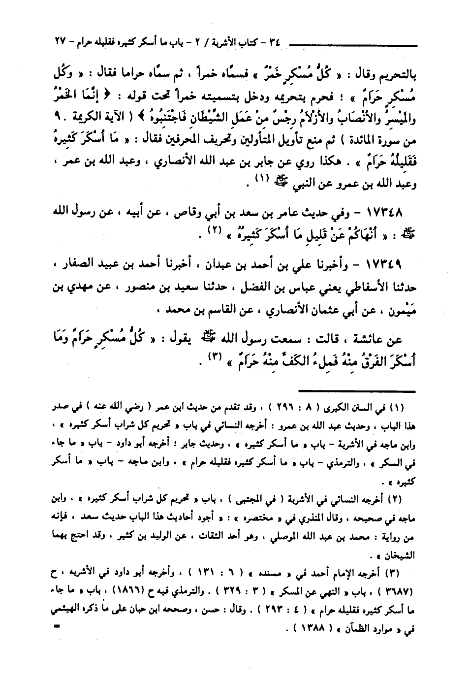 17349 - وَأَخْبَرَنَا عَلِيُّ بْنُ أَحْمَدَ بْنِ عَبْدَانَ، أَخْبَرَنَا أَحْمَدُ بْنُ عُبَيْدٍ الصَّفَّارُ، حَدَّثَنَا الْأَسْفَاطِيُّ يَعْنِي عَبَّاسَ بْنَ الْفَضْلِ، حَدَّثَنَا سَعِيدُ بْنُ مَنْصُورٍ، عَنْ مَهْدِيِّ بْنِ مَيْمُونٍ، عَنْ أَبِي عُثْمَانَ الْأَنْصَارِيِّ، عَنِ الْقَاسِمِ بْنِ مُحَمَّدٍ، عَنْ عَائِشَةَ قَالَتْ: سَمِعْتُ رَسُولَ اللَّهِ صَلَّى اللهُ عَلَيْهِ وَسَلَّمَ يَقُولُ: «§كُلُّ مُسْكِرٍ حَرَامٌ، وَمَا أَسْكَرَ الْفَرَقُ مِنْهُ فَمِلْءُ الْكَفِّ مِنْهُ حَرَامٌ» -[28]- رَوَاهُ أَبُو دَاوُدَ فِي كِتَابِ السُّنَنِ عَنْ مُسَدَّدٍ وَمُوسَى بْنِ إِسْمَاعِيلَ، عَنْ مَهْدِيِّ بْنِ مَيْمُونٍ،