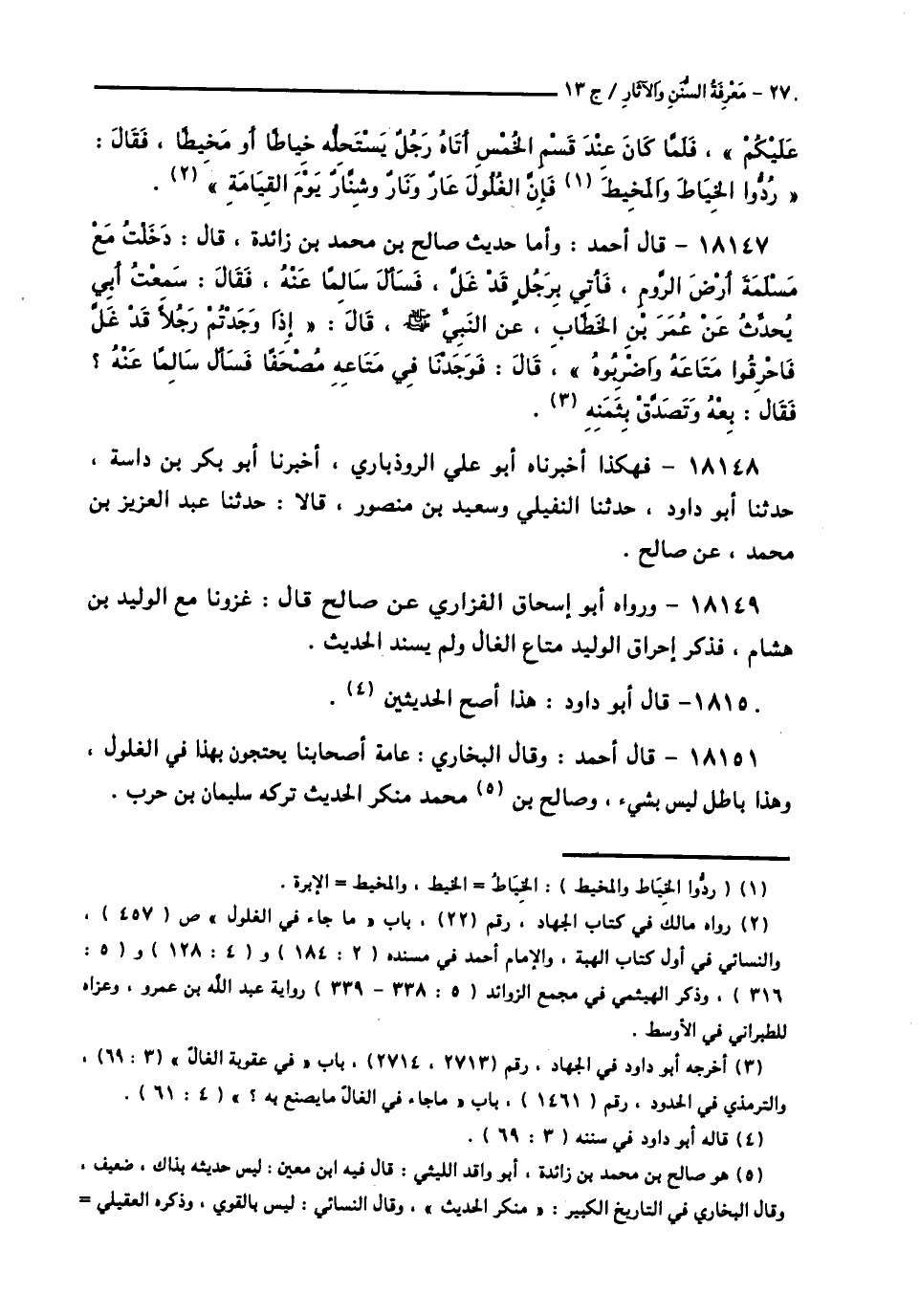 18151 - قَالَ أَحْمَدُ: وَقَالَ الْبُخَارِيُّ: عَامَّةُ أَصْحَابِنَا يَحْتَجُّونَ بِهَذَا فِي الْغُلُولِ، وَهَذَا بَاطِلٌ لَيْسَ بِشَيْءٍ، وَصَالِحُ بْنُ مُحَمَّدٍ مُنْكَرُ الْحَدِيثِ، تَرَكَهُ سُلَيْمَانُ بْنُ حَرْبٍ -[271]-