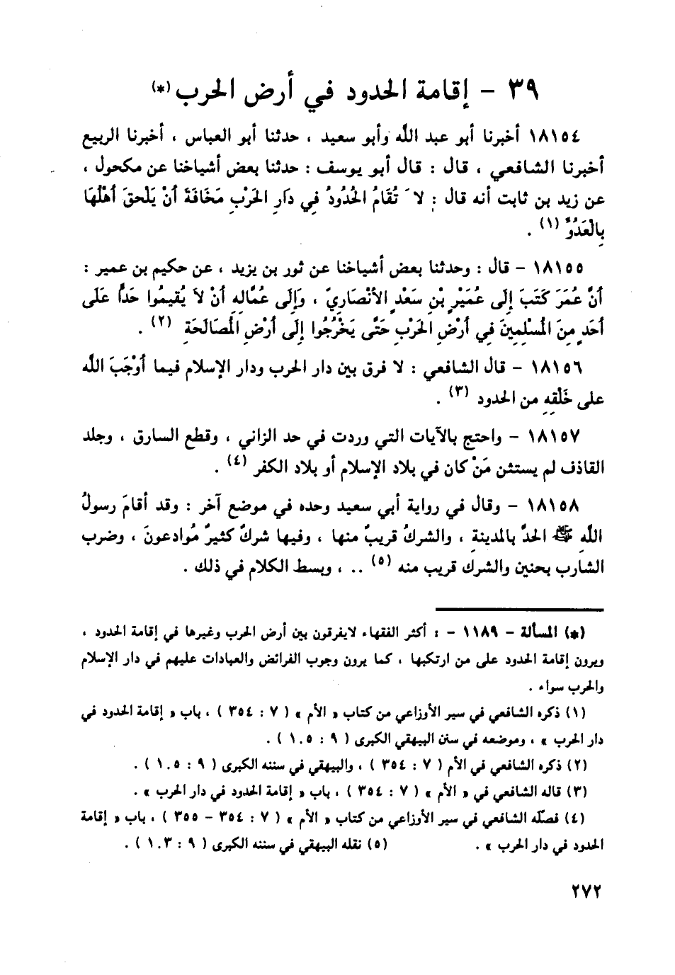 18154 - أَخْبَرَنَا أَبُو عَبْدِ اللَّهِ، وَأَبُو سَعِيدٍ، حَدَّثَنَا أَبُو الْعَبَّاسِ، أَخْبَرَنَا الرَّبِيعُ، أَخْبَرَنَا الشَّافِعِيُّ قَالَ: قَالَ أَبُو يُوسُفَ: حَدَّثَنَا بَعْضُ أَشْيَاخِنَا، عَنْ مَكْحُولٍ، عَنْ زَيْدِ بْنِ ثَابِتٍ، أَنَّهُ قَالَ: § «لَا تُقَامُ الْحُدُودُ فِي دَارِ الْحَرْبِ مَخَافَةَ أَنْ يَلْحَقَ أَهْلُهَا بِالْعَدُوِّ»