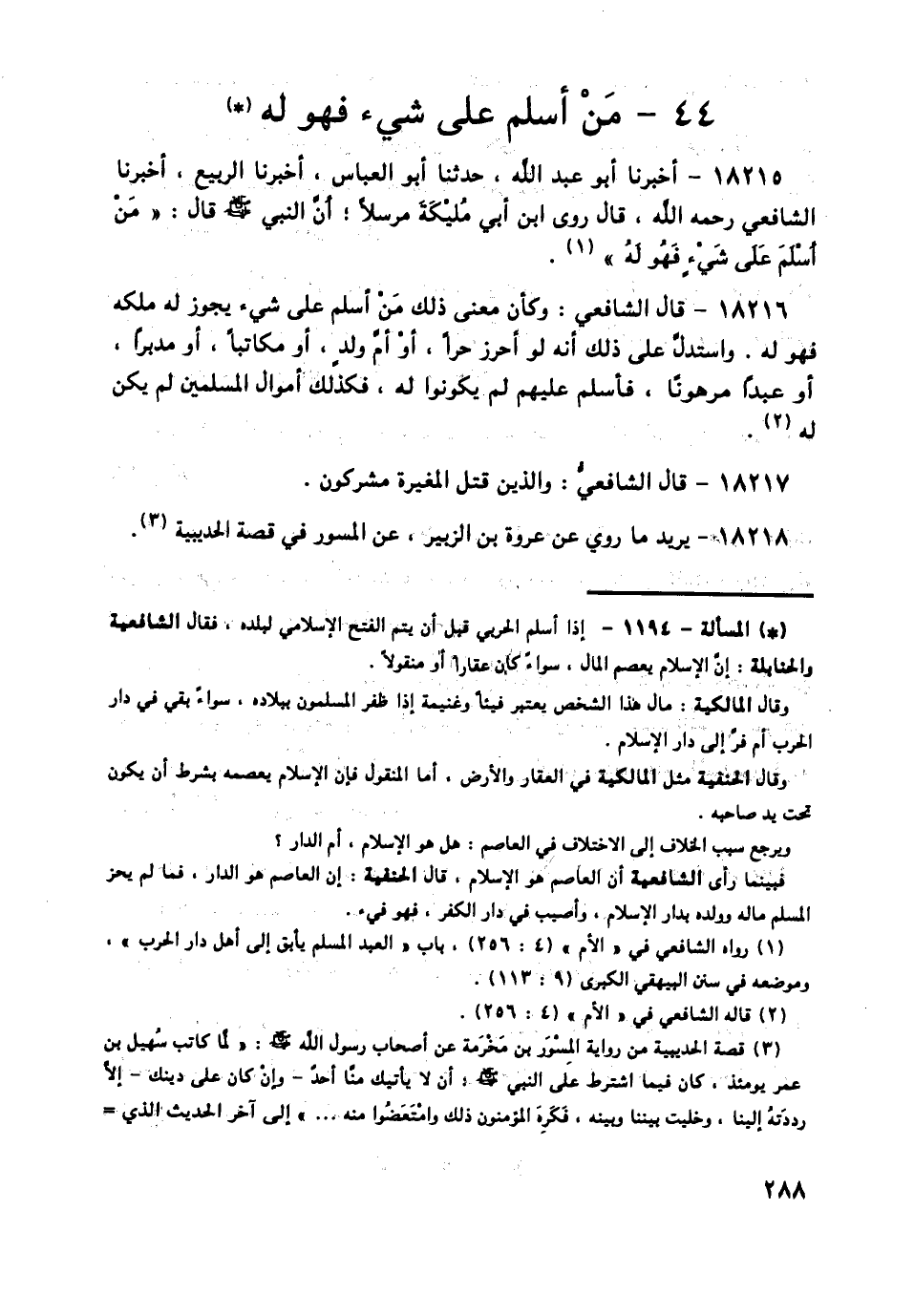 18216 - قَالَ الشَّافِعِيُّ: وَكَأَنَّ مَعْنَى ذَلِكَ: مَنْ أَسْلَمَ عَلَى شَيْءٍ يَجُوزُ لَهُ مِلْكُهُ فَهُوَ لَهُ وَاسْتَدَلَّ عَلَى ذَلِكَ أَنَّهُ لَوْ أَحْرَزَ حُرًّا، أَوْ أُمَّ وَلَدٍ، أَوْ مُكَاتَبًا، أَوْ مُدَبَّرًا، أَوْ عَبْدًا مَرْهُونًا، فَأَسْلَمَ عَلَيْهِمْ لَمْ يَكُونُوا لَهُ، فَكَذَلِكَ أَمْوَالُ الْمُسْلِمِينَ لَمْ يَكُنْ لَهُ
