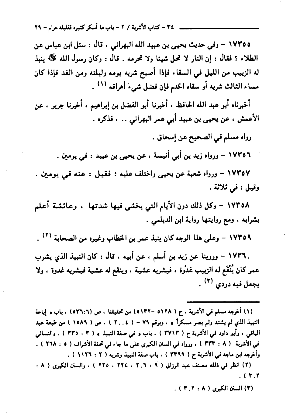 17355 - وَفِي حَدِيثِ يَحْيَى بْنِ عُبَيْدِ اللَّهِ الْبَهْرَانِيِّ قَالَ: سُئِلَ ابْنُ عَبَّاسٍ، عَنِ الطِّلَاءِ، فَقَالَ: إِنَّ النَّارَ لَا تُحِلُّ شَيْئًا وَلَا تُحَرِّمُهُ قَالَ: «وَكَانَ رَسُولُ اللَّهِ صَلَّى اللهُ عَلَيْهِ وَسَلَّمَ §يُنْبَذُ لَهُ الزَّبِيبُ مِنَ اللَّيْلِ فِي السِّقَاءِ، فَإِذَا أَصْبَحَ شَرِبَهُ يَوْمَهُ وَلَيْلَتَهُ، وَمِنَ الْغَدِ، فَإِذَا كَانَ مَسَاءُ الثَّالِثِ شَرِبَهُ أَوْ سَقَاهُ الْخَدَمَ، فَإِنْ فَضَلَ شَيْءٌ أَهْرَاقَهُ» أَخْبَرَنَاهُ أَبُو عَبْدِ اللَّهِ الْحَافِظُ، أَخْبَرَنَا أَبُو الْفَضْلِ بْنُ إِبْرَاهِيمَ، أَخْبَرَنَا جَرِيرٌ، عَنِ الْأَعْمَشِ، عَنْ يَحْيَى بْنِ عُبَيْدٍ أَبِي عُمَرَ الْبَهْرَانِيِّ، فَذَكَرَهُ رَوَاهُ مُسْلِمٌ فِي الصَّحِيحِ عَنْ إِسْحَاقَ