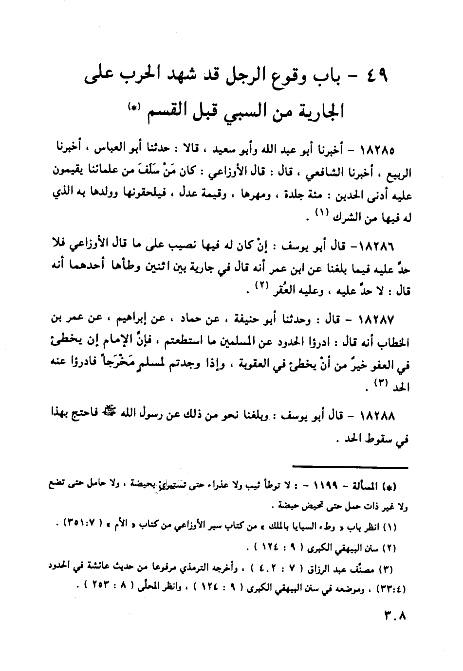 18292 - وَقَدْ قَالَ فِي رِوَايَتِنَا عَنْ أَبِي سَعِيدٍ، وَحْدَهُ فِي مَوْضِعٍ آخَرَ: أَخَذَ مِنْهُ عُقْرَهَا وَرُدَّتْ فِي الْمَغْنَمِ، فَإِنْ كَانَ مِنْ أَهْلِ الْجَهَالَةِ نُهِيَ، وَإِنْ كَانَ مِنْ أَهْلِ الْعِلْمِ عُزِّرَ، وَلَا حَدَّ مِنْ قِبَلِ الشُّبْهَةِ فِي أَنَّهُ مَلَكَ مِنْهَا شَيْئًا، وَإِنَّمَا قَصَدَ بِمَا قَالَ هَاهُنَا إِيلَاءَ عُذْرِ الْأَوْزَاعِيِّ فِيمَا قَالَ مِنْ أَدْنَى الْحَدَّيْنِ، وَاللَّهُ أَعْلَمُ