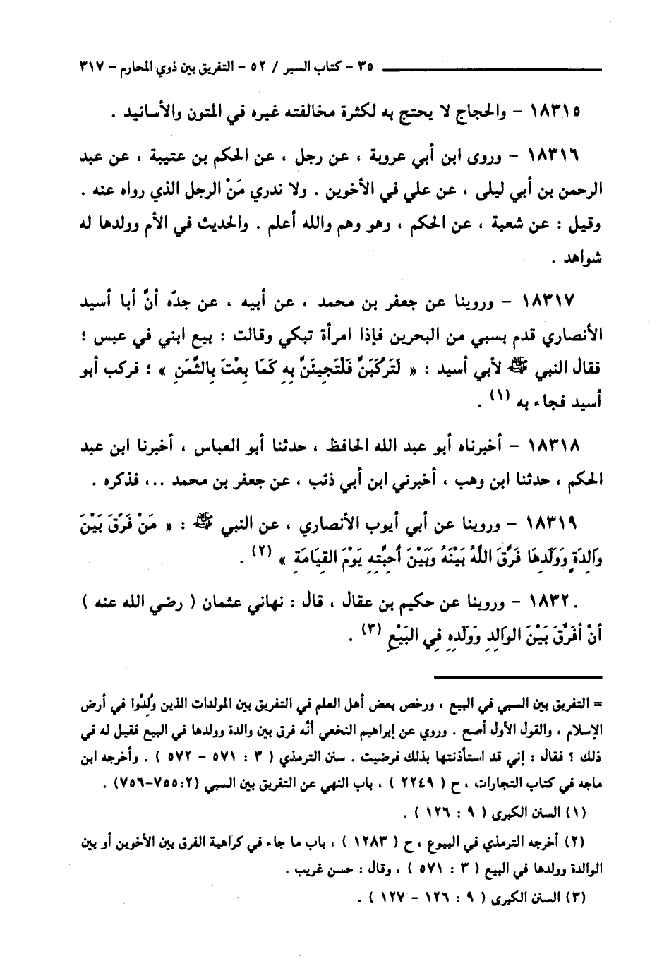 18320 - وَرُوِّينَا عَنْ حَكِيمِ بْنِ عِقَالٍ قَالَ: نَهَانِي عُثْمَانُ رَضِيَ اللَّهُ عَنْهُ، أَنْ أُفَرِّقَ بَيْنَ الْوَالِدِ وَوَلَدِهِ فِي الْبَيْعِ -[318]-