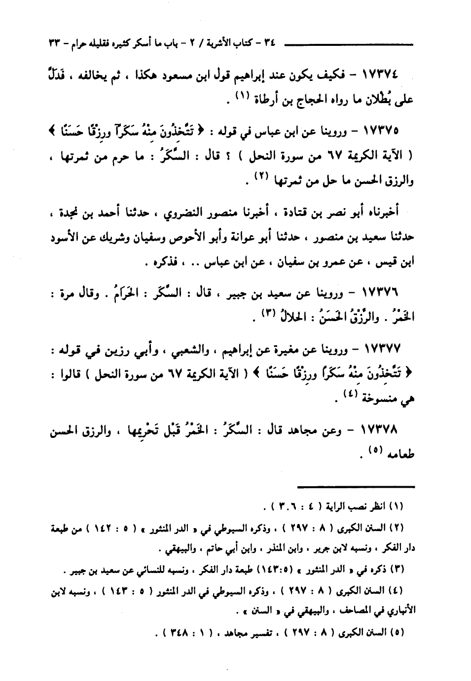 17375 - وَرُوِّينَا عَنِ ابْنِ عَبَّاسٍ فِي قَوْلِهِ: §تَتَّخِذُونَ مِنْهُ سَكَرًا وَرِزْقًا حَسَنًا قَالَ: «السَّكَرُ مَا حُرِّمَ مِنْ ثَمَرَتِهَا، وَالرِّزْقُ الْحَسَنُ مَا حَلَّ مِنْ ثَمَرَتِهَا» أَخْبَرَنَاهُ أَبُو نَصْرِ بْنُ قَتَادَةَ، أَخْبَرَنَا مَنْصُورٌ النَّضْرَوِيُّ، حَدَّثَنَا أَحْمَدُ بْنُ نَجْدَةَ، حَدَّثَنَا سَعِيدُ بْنُ مَنْصُورٍ، حَدَّثَنَا أَبُو عَوَانَةَ، وَأَبُو الْأَحْوَصِ، وَسُفْيَانُ، وَشَرِيكٌ، عَنِ الْأَسْوَدِ بْنِ قَيْسٍ، عَنْ عَمْرِو بْنِ سُفْيَانَ، عَنِ ابْنِ عَبَّاسٍ، فَذَكَرَهُ