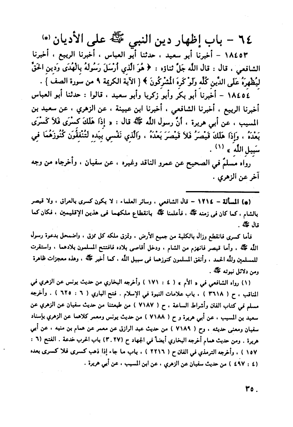 18454 - أَخْبَرَنَا أَبُو بَكْرٍ، وَأَبُو زَكَرِيَّا، وَأَبُو سَعِيدٍ، قَالُوا: حَدَّثَنَا أَبُو الْعَبَّاسِ، أَخْبَرَنَا الرَّبِيعُ، أَخْبَرَنَا الشَّافِعِيُّ، أَخْبَرَنَا ابْنُ عُيَيْنَةَ، عَنِ الزُّهْرِيِّ، عَنْ سَعِيدِ بْنِ الْمُسَيِّبِ، عَنْ أَبِي هُرَيْرَةَ، أَنَّ رَسُولَ اللَّهِ صَلَّى اللهُ عَلَيْهِ وَسَلَّمَ قَالَ: «§إِذَا هَلَكَ كِسْرَى فَلَا كِسْرَى بَعْدَهُ، وَإِذَا هَلَكَ قَيْصَرُ فَلَا قَيْصَرَ بَعْدَهُ، وَالَّذِي نَفْسِي بِيَدِهِ لَتُنْفِقُونَ كُنُوزَهُمَا فِي سَبِيلِ اللَّهِ» رَوَاهُ مُسْلِمٌ فِي الصَّحِيحِ عَنْ عَمْرٍو النَّاقِدِ وَغَيْرِهِ، عَنْ سُفْيَانَ وَأَخْرَجَاهُ مِنْ وَجْهٍ آخَرَ عَنِ الزُّهْرِيِّ -[351]-