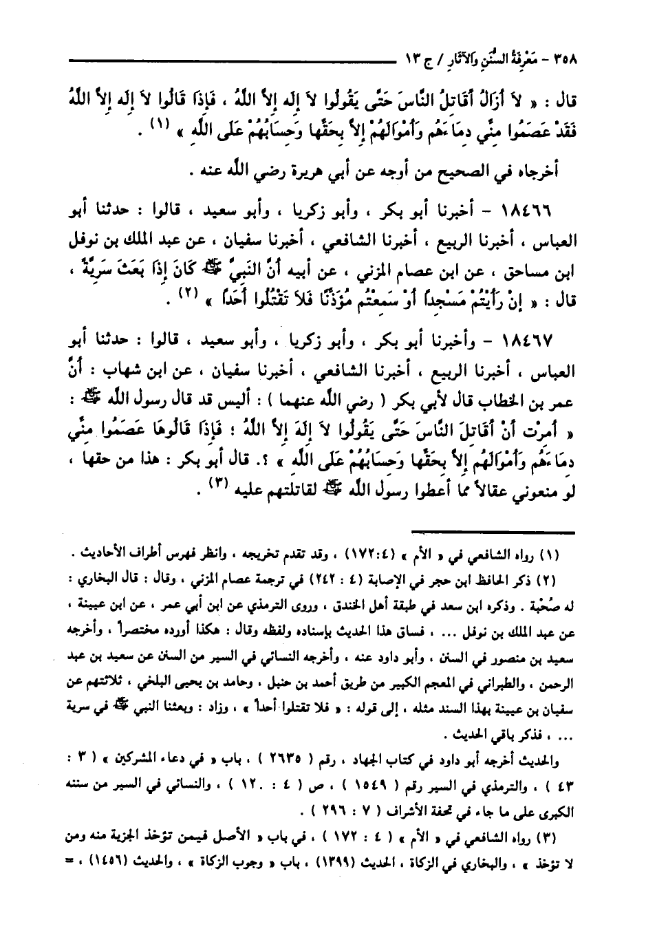 18467 - وَأَخْبَرَنَا أَبُو بَكْرٍ، وَأَبُو زَكَرِيَّا، وَأَبُو سَعِيدٍ، قَالُوا: حَدَّثَنَا أَبُو الْعَبَّاسِ، أَخْبَرَنَا الرَّبِيعُ، أَخْبَرَنَا الشَّافِعِيُّ، أَخْبَرَنَا سُفْيَانُ، عَنِ ابْنِ شِهَابٍ، أَنَّ عُمَرَ بْنَ الْخَطَّابِ، قَالَ لِأَبِي بَكْرٍ رَضِيَ اللَّهُ عَنْهُمَا: أَلَيْسَ قَدْ قَالَ رَسُولُ اللَّهِ صَلَّى اللهُ عَلَيْهِ وَسَلَّمَ: " §أُمِرْتُ أَنْ أُقَاتِلَ النَّاسَ حَتَّى يَقُولُوا: لَا إِلَهَ إِلَّا اللَّهُ، فَإِذَا قَالُوهَا عَصَمُوا مِنِّي دِمَاءَهُمْ وَأَمْوَالَهُمْ إِلَّا بِحَقِّهَا، وَحِسَابُهُمْ عَلَى اللَّهِ "؟ قَالَ أَبُو بَكْرٍ: هَذَا مِنْ حَقِّهَا، لَوْ مَنَعُونِي عِقَالًا مِمَّا أَعْطُوا رَسُولَ اللَّهِ صَلَّى اللهُ عَلَيْهِ وَسَلَّمَ لَقَاتَلْتُهُمْ عَلَيْهِ -[359]-.