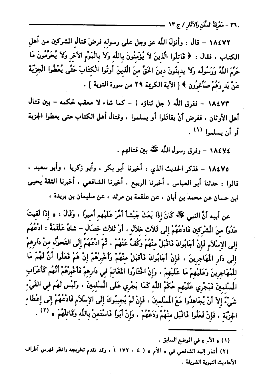 18475 - فَذَكَرَ الْحَدِيثَ الَّذِي: أَخْبَرَنَا أَبُو بَكْرٍ، وَأَبُو زَكَرِيَّا، وَأَبُو سَعِيدٍ، قَالُوا: حَدَّثَنَا أَبُو الْعَبَّاسِ، أَخْبَرَنَا الرَّبِيعُ، أَخْبَرَنَا الشَّافِعِيُّ، أَخْبَرَنَا الثِّقَةُ يَحْيَى بْنُ حَسَّانَ، عَنْ مُحَمَّدِ بْنِ أَبَانَ، عَنْ عَلْقَمَةَ بْنِ مَرْثَدٍ، عَنْ سُلَيْمَانَ بْنِ بُرَيْدَةَ، عَنْ أَبِيهِ، أَنَّ النَّبِيَّ صَلَّى اللهُ عَلَيْهِ وَسَلَّمَ كَانَ إِذَا بَعَثَ جَيْشًا أَمَّرَ عَلَيْهِمْ أَمِيرًا وَقَالَ: § «إِذَا لَقِيتَ عَدُوًّا مِنَ الْمُشْرِكِينَ فَادْعُهُمْ إِلَى ثَلَاثِ خِلَالٍ - أَوْ ثَلَاثِ خِصَالٍ، شَكَّ عَلْقَمَةُ - ادْعُهُمْ إِلَى الْإِسْلَامِ فَإِنْ أَجَابُوكَ فَاقْبَلْ مِنْهُمْ وَكُفَّ عَنْهُمْ، ثُمَّ ادْعُهُمْ إِلَى التَّحَوُّلِ مِنْ دَارِهِمْ إِلَى دَارِ الْمُهَاجِرِينَ، فَإِنْ أَجَابُوكَ فَاقْبَلْ مِنْهُمْ وَأَخْبِرْهُمْ إِنْ هُمْ فَعَلُوا أَنَّ لَهُمُ مَا لِلْمُهَاجِرِينَ وَعَلَيْهِمْ مَا عَلَيْهِمْ، وَإِنِ اخْتَارُوا الْمَغَانِمَ فِي دَارِهِمْ فَأَخْبِرْهُمْ أَنَّهُمْ كَأَعْرَابِ الْمُسْلِمِينَ فَيَجْرِي عَلَيْهِمْ حُكْمُ اللَّهِ كَمَا يَجْرِي عَلَى الْمُسْلِمِينَ، وَلَيْسَ لَهُمْ فِي الْفَيْءِ شَيْءٌ إِلَّا أَنْ يُجَاهِدُوا مَعَ الْمُسْلِمِينَ، فَإِنْ لَمْ يُجِيبُوكَ إِلَى الْإِسْلَامِ فَادْعُهُمْ إِلَى إِعْطَاءِ الْجِزْيَةِ، فَإِنْ فَعَلُوا فَاقْبَلْ مِنْهُمْ وَدَعْهُمْ، وَإِنْ أَبَوْا فَاسْتَعِنْ بِاللَّهِ وَقَاتِلْهُمْ» -[361]-