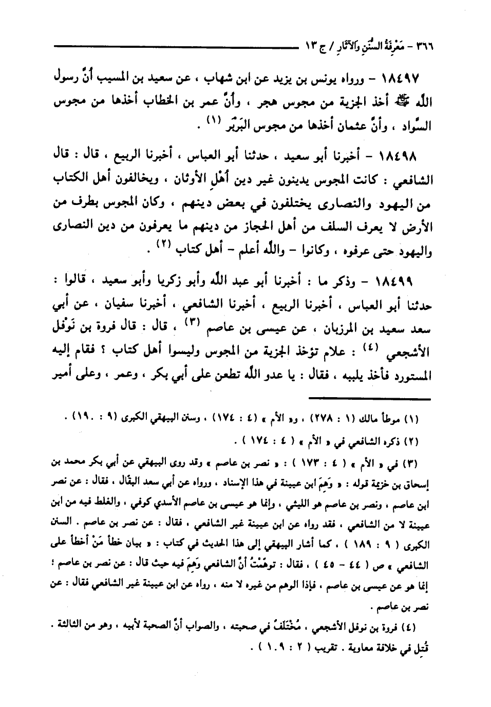 18498 - أَخْبَرَنَا أَبُو سَعِيدٍ، حَدَّثَنَا أَبُو الْعَبَّاسِ، أَخْبَرَنَا الرَّبِيعُ قَالَ: قَالَ الشَّافِعِيُّ: «كَانَتِ §الْمَجُوسُ يَدِينُونَ غَيْرَ دِينِ أَهْلِ الْأَوْثَانِ، وَيُخَالِفُونَ أَهْلَ الْكِتَابِ مِنَ الْيَهُودِ وَالنَّصَارَى يَخْتَلِفُونَ فِي بَعْضِ دِينِهِمْ، وَكَانَ الْمَجُوسُ بِطَرَفٍ مِنَ الْأَرْضِ لَا يَعْرِفُ السَّلَفُ مِنْ أَهْلِ الْحِجَازِ مِنْ دِينِهِمْ مَا يَعْرِفُونَ مِنْ دِينِ النَّصَارَى وَالْيَهُودِ حَتَّى عَرَفُوهُ، وَكَانُوا، وَاللَّهُ أَعْلَمُ، أَهْلَ كِتَابٍ»