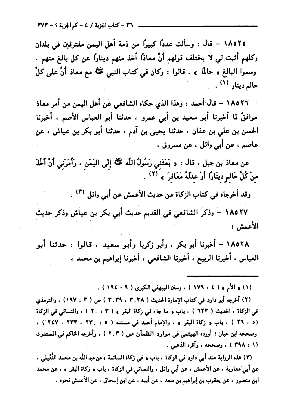 18526 - قَالَ أَحْمَدُ: وَهَذَا الَّذِي حَكَاهُ الشَّافِعِيُّ عَنْ أَهْلِ الْيَمَنِ مِنْ أَمْرِ مُعَاذٍ مُوَافِقٌ لِمَا أَخْبَرَنَا أَبُو سَعِيدِ بْنُ أَبِي عَمْرٍو، حَدَّثَنَا أَبُو الْعَبَّاسِ الْأَصَمُّ، أَخْبَرَنَا الْحَسَنُ بْنُ عَلِيِّ بْنِ عَفَّانَ، حَدَّثَنَا يَحْيَى بْنُ آدَمَ، حَدَّثَنَا أَبُو بَكْرِ بْنُ عَيَّاشٍ، عَنْ عَاصِمٍ، عَنْ أَبِي وَائِلٍ، عَنْ مَسْرُوقٍ، عَنْ مُعَاذِ بْنِ جَبَلٍ قَالَ: «§بَعَثَنِي رَسُولُ اللَّهِ صَلَّى اللهُ عَلَيْهِ وَسَلَّمَ إِلَى الْيَمَنِ، وَأَمَرَنِي أَنْ آخُذَ مِنْ كُلِّ حَالِمٍ دِينَارًا أَوْ عِدْلَهُ مَعَافِرَ» وَقَدْ أَخْرَجَاهُ فِي كِتَابِ الزَّكَاةِ مِنْ حَدِيثِ الْأَعْمَشِ عَنْ أَبِي وَائِلٍ