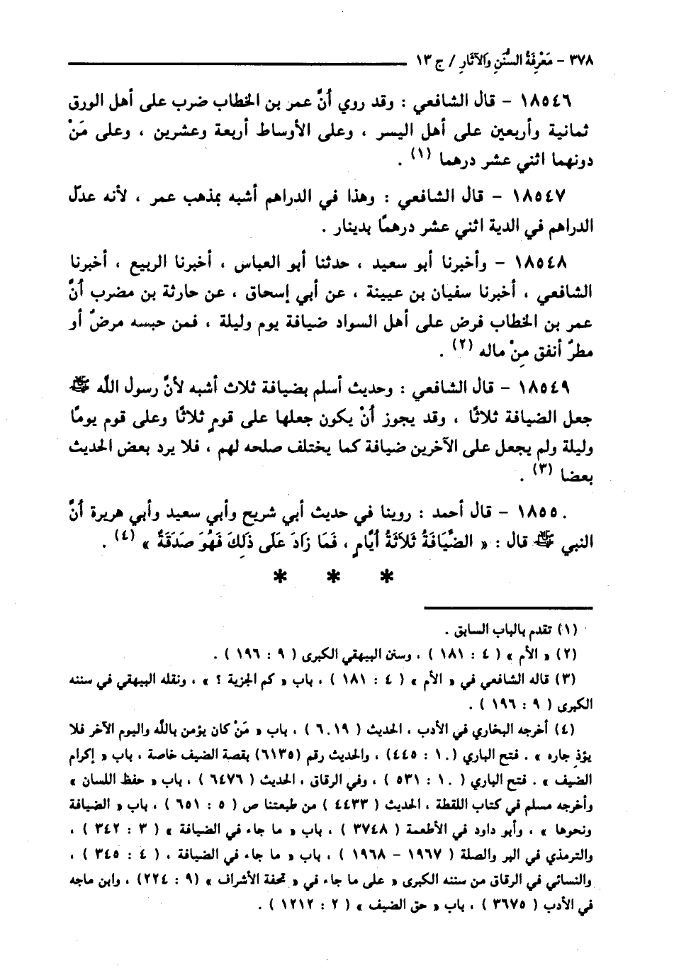 18549 - قَالَ الشَّافِعِيُّ: وَحَدِيثُ أَسْلَمَ بِضِيَافَةِ ثَلَاثٍ أَشْبَهُ لِأَنَّ رَسُولَ اللَّهِ صَلَّى اللهُ عَلَيْهِ وَسَلَّمَ جَعَلَ الضِّيَافَةَ ثَلَاثًا، وَقَدْ يَجُوزُ أَنْ يَكُونَ جَعَلَهَا عَلَى قَوْمٍ ثَلَاثًا، وَعَلَى قَوْمٍ يَوْمًا وَلَيْلَةً، وَلَمْ يَجْعَلْ عَلَى الْآخَرِينَ ضِيَافَةً، كَمَا يَخْتَلِفُ صُلْحُهُ لَهُمْ، فَلَا يَرُدُّ بَعْضُ الْحَدِيثِ بَعْضًا