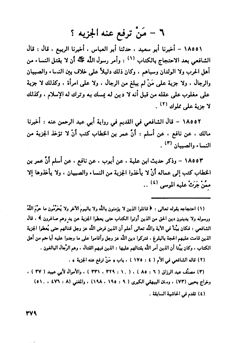 18552 - قَالَ الشَّافِعِيُّ فِي الْقَدِيمِ فِي رِوَايَةِ أَبِي عَبْدِ الرَّحْمَنِ عَنْهُ: أَخْبَرَنَا مَالِكٌ، عَنْ نَافِعٍ، عَنْ أَسْلَمَ، أَنَّ عُمَرَ بْنَ الْخَطَّابِ كَتَبَ: «أَنْ لَا تُؤْخَذَ الْجِزْيَةُ مِنَ النِّسَاءِ وَالصِّبْيَانِ»