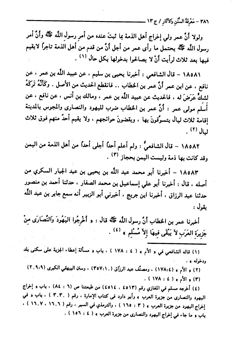 18583 - أَخْبَرَنَا أَبُو مُحَمَّدٍ عَبْدُ اللَّهِ بْنُ يَحْيَى بْنِ عَبْدِ الْجَبَّارِ السُّكَّرِيُّ، مِنْ أَصْلِهِ قَالَ: أَخْبَرَنَا أَبُو عَلِيٍّ إِسْمَاعِيلُ بْنُ مُحَمَّدٍ الصَّفَّارُ، حَدَّثَنَا أَحْمَدُ بْنُ مَنْصُورٍ، حَدَّثَنَا عَبْدُ الرَّزَّاقِ، أَخْبَرَنَا ابْنُ جُرَيْجٍ، أَخْبَرَنِي أَبُو الزُّبَيْرِ، أَنَّهُ سَمِعَ جَابِرَ بْنَ عَبْدِ اللَّهِ، يَقُولُ: أَخْبَرَنَا عُمَرُ بْنُ الْخَطَّابِ، أَنَّ رَسُولَ اللَّهِ صَلَّى اللهُ عَلَيْهِ وَسَلَّمَ قَالَ: «§أَخْرِجُوا الْيَهُودَ، وَالنَّصَارَى مِنْ جَزِيرَةِ الْعَرَبِ، لَا يَبْقَى فِيهَا إِلَّا مُسْلِمٌ» -[387]- رَوَاهُ مُسْلِمُ بْنُ الْحَجَّاجِ فِي الصَّحِيحِ، عَنْ مُحَمَّدِ بْنِ رَافِعٍ، عَنْ عَبْدِ الرَّزَّاقِ