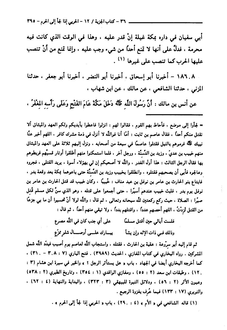 18608 - أَخْبَرَنَا أَبُو إِسْحَاقَ، أَخْبَرَنَا أَبُو النَّضْرِ، أَخْبَرَنَا أَبُو جَعْفَرٍ، حَدَّثَنَا الْمُزَنِيُّ، حَدَّثَنَا الشَّافِعِيُّ، عَنْ مَالِكٍ، عَنِ ابْنِ شِهَابٍ، عَنْ أَنَسِ بْنِ مَالِكٍ، أَنَّ رَسُولَ اللَّهِ صَلَّى اللهُ عَلَيْهِ وَسَلَّمَ §دَخَلَ مَكَّةَ عَامَ الْفَتْحِ وَعَلَى رَأْسِهِ الْمِغْفَرُ -[396]-، فَلَمَّا نَزَعَهُ جَاءَهُ رَجُلٌ فَقَالَ: يَا رَسُولَ اللَّهِ، إِنَّ ابْنَ خَطَلٍ مُتَعَلِّقٌ بِأَسْتَارِ الْكَعْبَةِ، فَقَالَ رَسُولُ اللَّهِ صَلَّى اللهُ عَلَيْهِ وَسَلَّمَ: «اقْتُلُوهُ» أَخْرَجَاهُ فِي الصَّحِيحِ مِنْ حَدِيثِ مَالِكٍ