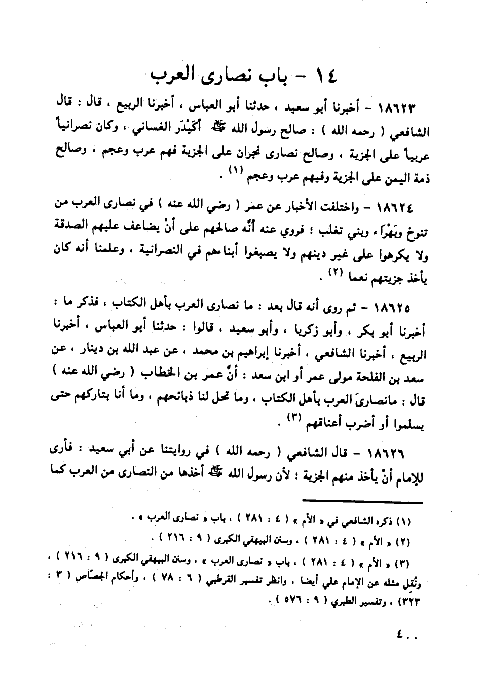 18624 - وَاخْتَلَفَتِ الْأَخْبَارُ عَنْ عُمَرَ رَضِيَ اللَّهُ عَنْهُ فِي نَصَارَى الْعَرَبِ مِنْ تَنُوخَ وَبَهْرَاءَ وَبَنِي تَغْلِبَ، فَرُوِيَ عَنْهُ أَنَّهُ صَالَحَهُمْ عَلَى أَنْ يُضَاعِفَ عَلَيْهِمُ الصَّدَقَةَ وَلَا يُكْرَهُوا عَلَى غَيْرِ دِينِهِمْ، وَلَا يَصْبُغُوا أَبْنَاءَهُمْ فِي النَّصْرَانِيَّةِ، وَعَلِمْنَا أَنَّهُ كَانَ يَأْخُذُ جِزْيَتَهُمْ نَعَمًا