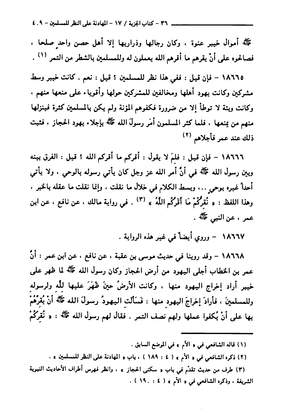 18668 - وَقَدْ رُوِّينَا فِي حَدِيثِ مُوسَى بْنِ عُقْبَةَ، عَنْ نَافِعٍ، عَنِ ابْنِ عُمَرَ، أَنَّ عُمَرَ بْنَ الْخَطَّابِ، أَجْلَى الْيَهُودَ مِنْ أَرْضِ الْحِجَازِ، وَكَانَ رَسُولُ اللَّهِ صَلَّى اللهُ عَلَيْهِ وَسَلَّمَ لَمَّا ظَهَرَ عَلَى خَيْبَرَ أَرَادَ إِخْرَاجَ الْيَهُودِ مِنْهَا، وَكَانَتِ الْأَرْضُ حِينَ ظَهَرَ عَلَيْهَا لِلَّهِ وَلِرَسُولِهِ وَلِلْمُسْلِمِينَ، فَأَرَادَ إِخْرَاجَ الْيَهُودِ مِنْهَا فَسَأَلَتِ الْيَهُودُ رَسُولَ اللَّهِ صَلَّى اللهُ عَلَيْهِ وَسَلَّمَ أَنَّ يُقِرَّهُمْ بِهَا عَلَى أَنْ يُكْفَوْا عَمَلَهَا وَلَهُمْ نِصْفُ التَّمْرِ، فَقَالَ لَهُمْ رَسُولُ اللَّهِ صَلَّى اللهُ عَلَيْهِ وَسَلَّمَ: «§نُقِرُّكُمْ -[410]- بِهَا عَلَى ذَلِكَ مَا شِئْنَا»، فَقُرُّوا بِهَا حَتَّى أَجْلَاهُمْ عُمَرُ فِي إِمَارَتِهِ إِلَى تَيْمَا وَأَرِيحَا أَخْبَرَنَاهُ أَبُو طَاهِرٍ الْفَقِيهُ، أَخْبَرَنَا أَبُو بَكْرٍ الْقَطَّانُ، حَدَّثَنَا أَبُو الْأَزْهَرِ، حَدَّثَنَا مُحَمَّدُ بْنُ شُرَحْبِيلَ، أَخْبَرَنَا ابْنُ جُرَيْجٍ، حَدَّثَنَا مُوسَى بْنُ عُقْبَةَ، فَذَكَرَهُ أَخْرَجَاهُ فِي الصَّحِيحِ
