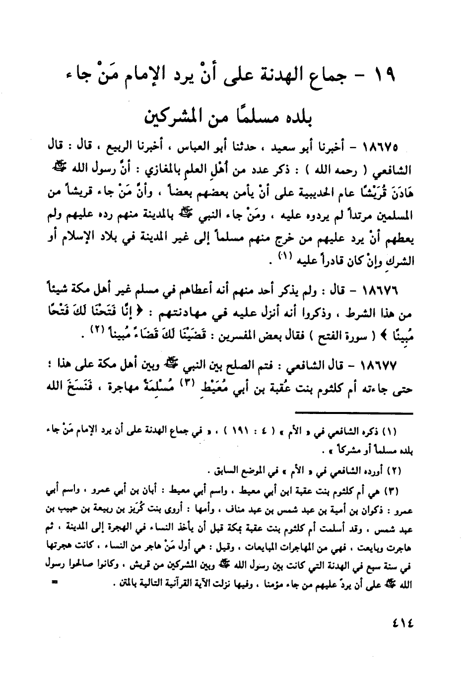 §جُمَّاعُ الْهُدْنَةِ عَلَى أَنْ يَرُدَّ الْإِمَامُ مَنْ جَاءَ بَلَدَهُ مُسْلِمًا مِنَ الْمُشْرِكِينَ
