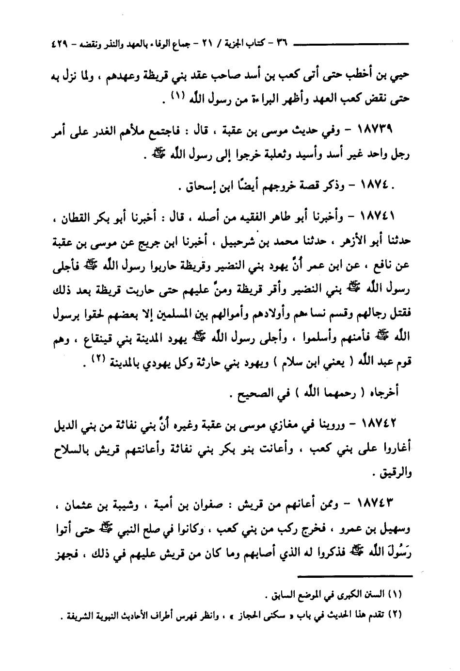 18741 - وَأَخْبَرَنَا أَبُو طَاهِرٍ الْفَقِيهُ، مِنْ أَصْلِهِ قَالَ: أَخْبَرَنَا أَبُو بَكْرٍ الْقَطَّانُ، حَدَّثَنَا أَبُو الْأَزْهَرِ، حَدَّثَنَا مُحَمَّدُ بْنُ شُرَحْبِيلَ، أَخْبَرَنَا ابْنُ جُرَيْجٍ، عَنْ مُوسَى بْنِ عُقْبَةَ، عَنْ نَافِعٍ، عَنِ ابْنِ عُمَرَ، أَنَّ يَهُودَ بَنِي النَّضِيرِ، وَقُرَيْظَةَ، حَارَبُوا رَسُولَ اللَّهِ صَلَّى اللهُ عَلَيْهِ وَسَلَّمَ § «فَأَجْلَى رَسُولُ اللَّهِ صَلَّى اللهُ عَلَيْهِ وَسَلَّمَ بَنِي النَّضِيرِ وَأَقَرَّ قُرَيْظَةَ وَمَنَّ عَلَيْهِمْ، حَتَّى حَارَبَتْ قُرَيْظَةُ بَعْدَ ذَلِكَ فَقَتَلَ رِجَالَهُمْ وَقَسَمَ نِسَاءَهُمْ وَأَوْلَادَهُمْ وَأَمْوَالَهُمْ بَيْنَ الْمُسْلِمِينَ»، إِلَّا بَعْضَهُمْ لَحِقُوا بِرَسُولِ اللَّهِ صَلَّى اللهُ عَلَيْهِ وَسَلَّمَ فَأَمَّنَهُمْ وَأَسْلَمُوا، «وَأَجْلَى رَسُولُ اللَّهِ صَلَّى اللهُ عَلَيْهِ وَسَلَّمَ يَهُودَ الْمَدِينَةِ بَنِي قَيْنُقَاعَ، وَهُمْ قَوْمُ عَبْدِ اللَّهِ - يَعْنِي ابْنَ سَلَّامٍ، وَيَهُودَ بَنِي حَارِثَةَ، وَكُلَّ يَهُودِيٍّ بِالْمَدِينَةِ» أَخْرَجَاهُ رَحِمَهُمَا اللَّهُ فِي الصَّحِيحِ