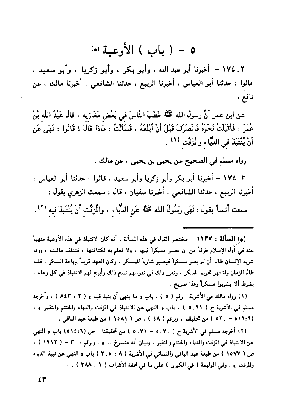 17402 - أَخْبَرَنَا أَبُو عَبْدِ اللَّهِ، وَأَبُو بَكْرٍ، وَأَبُو زَكَرِيَّا، وَأَبُو سَعِيدٍ، قَالُوا: حَدَّثَنَا أَبُو الْعَبَّاسِ، أَخْبَرَنَا الرَّبِيعُ، حَدَّثَنَا الشَّافِعِيُّ، أَخْبَرَنَا مَالِكٌ، عَنْ نَافِعٍ، عَنِ ابْنِ عُمَرَ، أَنَّ رَسُولَ اللَّهِ صَلَّى اللهُ عَلَيْهِ وَسَلَّمَ خَطَبَ النَّاسَ فِي بَعْضِ مَغَازِيهِ قَالَ عَبْدُ اللَّهِ بْنُ عُمَرَ: فَأَقْبَلْتُ نَحْوَهُ، فَانْصَرَفَ قَبْلَ أَنْ أَبْلُغَهُ، فَسَأَلْتُ: مَاذَا قَالَ؟ قَالُوا: § «نَهَى عَنْ أَنْ يُنْتَبَذَ فِي الدُّبَّاءِ وَالْمُزَفَّتِ» رَوَاهُ مُسْلِمٌ فِي الصَّحِيحِ، عَنْ يَحْيَى بْنِ يَحْيَى، عَنْ مَالِكٍ
